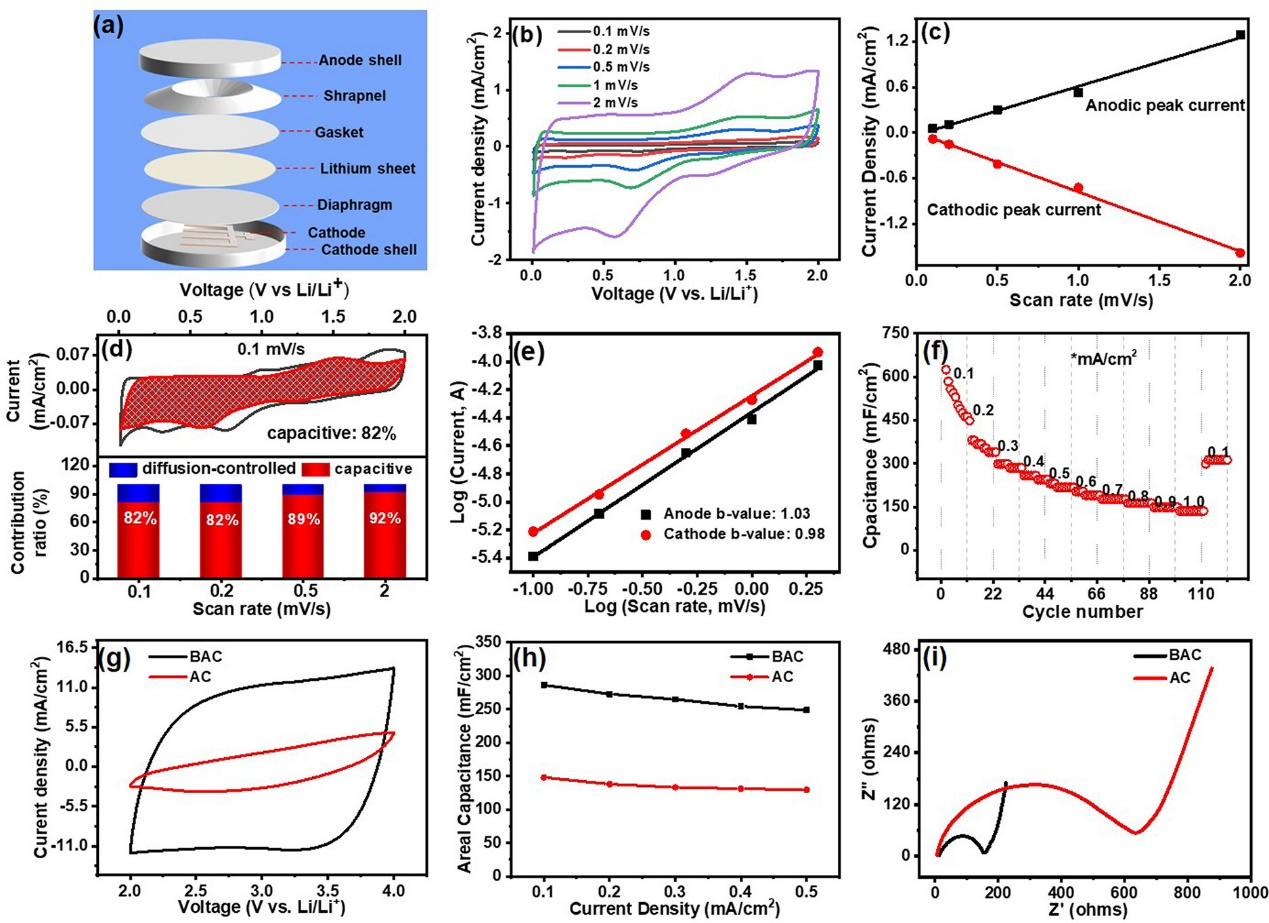 在半电池中,一系列的动力学过程实验表征表明,CoMoO4/RGO的电化学过程主要为表面诱导的赝电容行为,表现出669.2 mF/cm2 (371.8 μAh/cm2)的高面积比电容。而BAC则表现为双电层电容行为。与商用活性炭AC相比,BAC具有更高的面积比容和优异的倍率性能。在0.1 mA/cm2的电流密度下,其面积比容量为286.2 mF/cm2;当电流密度提升至0.7mA/cm2时,仍可保持243.92 mF/cm2的面积容量。这是由于其具有更多的孔隙结构,从而具有更大的比表面积,更小的电荷转移电阻和更好的锂离子扩散能力。