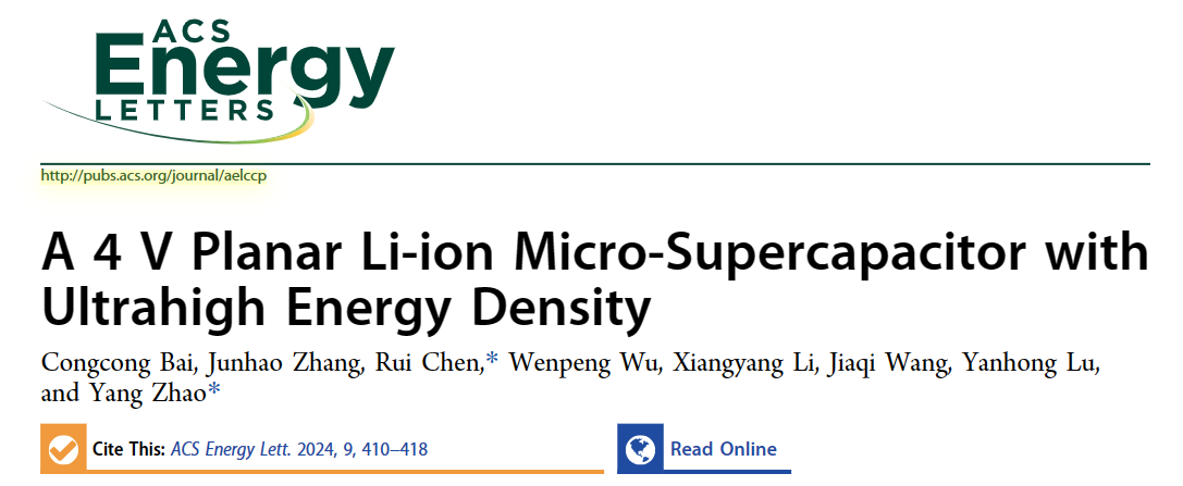 近日,taptap点点体育硕士生白聪聪第一作者身份在国际顶级期刊《ACS Energy Letters》(IF: 22)发表题目为“A 4 V Planar Li-ion Micro-Supercapacitor with Ultrahigh Energy Density”的研究论文(DOI:10.1021/acsenergylett.3c02406)。taptap点点体育为论文第一通讯单位,taptap点点体育赵扬特别研究员和陈瑞博士后为共同通讯作者。