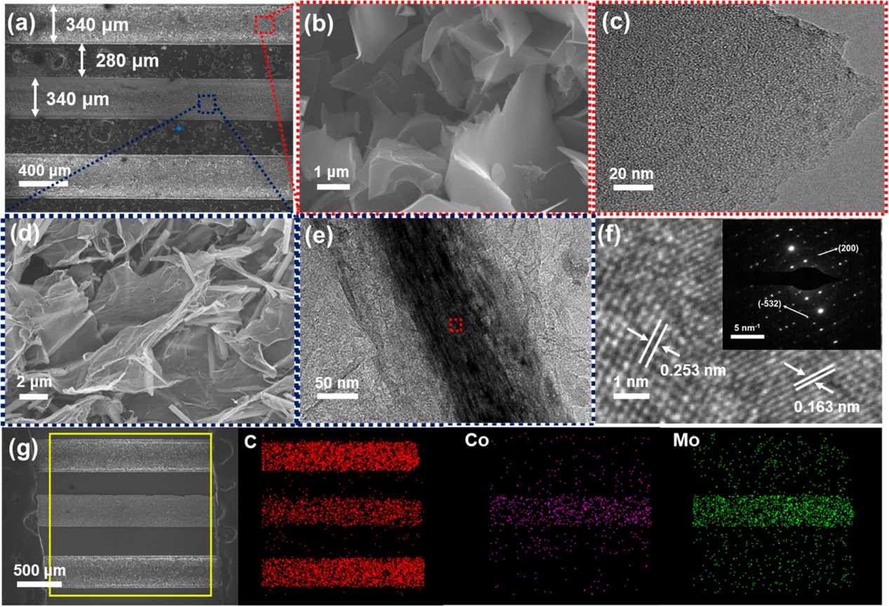 本工作采用CoMoO4/RGO和竹源活性炭BAC分别作为电池型和电容型电极。由于激光的高精度,LIMC单个手指宽度和电极间隙仅为340 µm和280 µm。扫描电镜图像及mapping、透射电镜图像证明了非对称微电极的成功构筑。