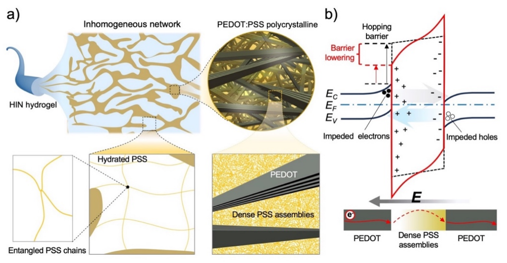 taptap点点体育赵飞教授团队设计了一种名为“分级非均质网络”(HIN)的特殊水凝胶结构,就像在材料内部搭建了“电子高速公路”(图1a),打破了导电水凝胶内部离子主导电荷传输机制的传统认知。具体而言,该HIN结构水凝胶的组成包括:1)柔软的“水合PSS网络”由PSS聚合物链相互缠绕形成,就像一张弹性十足的 “水网”,赋予材料柔韧性和保水性;2)导电“PEDOT:PSS多晶相”中,PEDOT微晶像“铺路砖”,并通过致密的PSS聚集体桥接,形成相互交错的导电网络。更巧妙地,PEDOT多晶相的内部应力限制了周围PSS聚集体的水合程度,形成了一个“超高离子浓度微环境”。当施加电场时,这一环境就像“润滑剂”,大幅降低电子在PEDOT微晶之间跳跃的能量障碍,促进电子跳跃(图1b),从而在水凝胶中形成以电子主导的电信号快速传输通路,而非像传统水凝胶那样依赖缓慢的离子迁移。该研究通过调控聚合物网络的微观结构,在水凝胶中构建电子主导的电荷传输路径,为高频柔性电子器件及超灵敏生物传感器的开发提供了新策略。