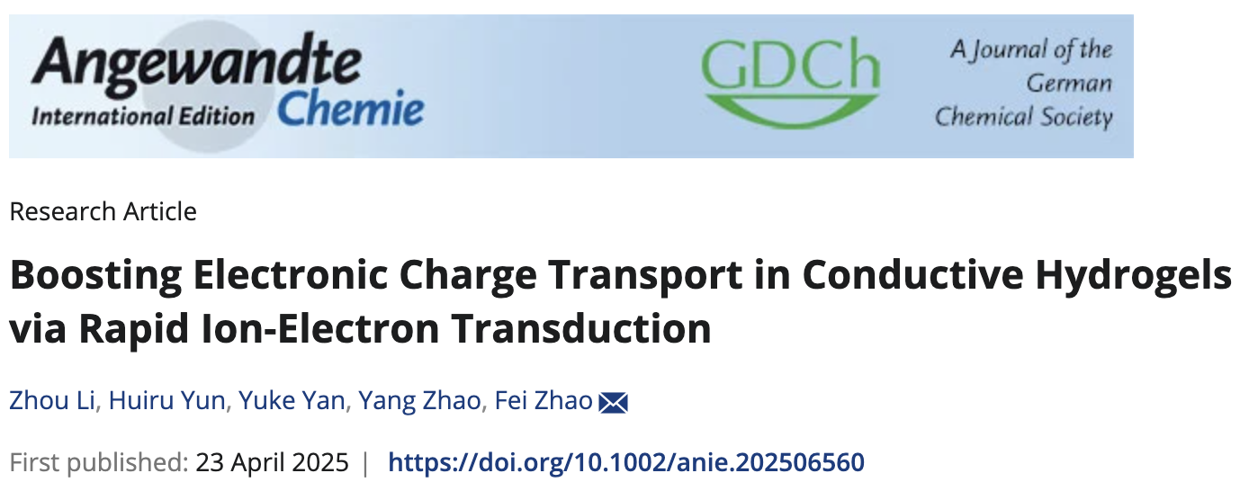近日,taptap点点体育赵飞教授研究团队在国际顶级期刊《Angew. Chem., Int. Ed.》发表题目为“Boosting Electronic Charge Transport in Conductive Hydrogels via Rapid Ion-Electron Transduction”的研究论文(DOI:10.1002/anie.202506560),论文通讯单位为taptap点点体育,第一作者为taptap点点体育的博士生李洲。