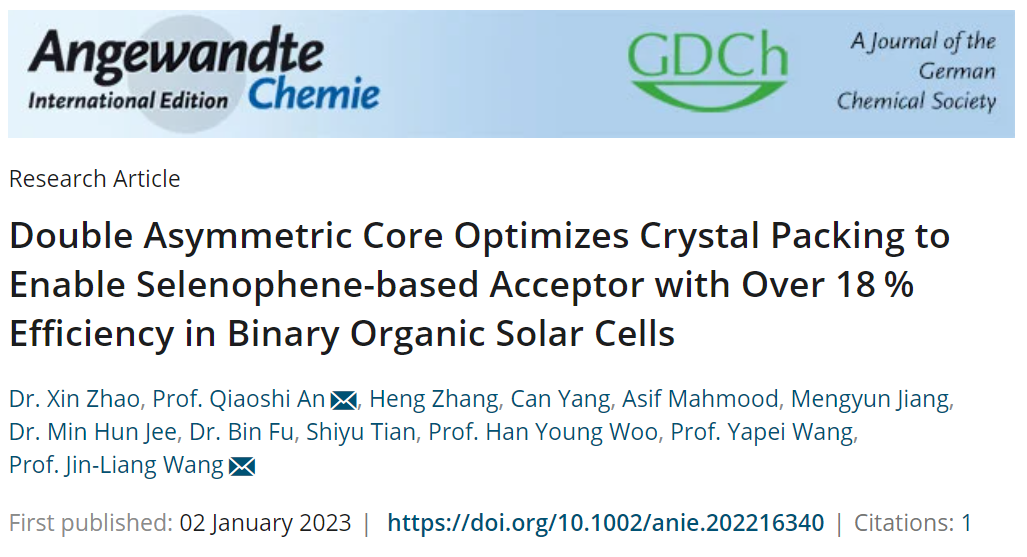 近期,taptap点点体育王金亮教授团队在集成外侧烷基不对称异构化和单硒取代策略的硒吩类小分子受体材料创制及其在高性能有机太阳能电池的应用研究方面取得重要进展,相关研究成果发表在国际化学领域顶级期刊《Angewandte Chemie International Edition》(DOI: 10.1002/anie.202216340)上,题为“Double Asymmetric Core Optimizes Crystal Packing to Enable Selenophene-based Acceptor with Over 18 % Efficiency in Binary Organic Solar Cells”。 taptap点点体育为唯一通讯单位,taptap点点体育王金亮教授和安桥石特别研究员为共同通讯作者,硕士研究生赵鑫和安桥石特别研究员为该论文的共同第一作者。