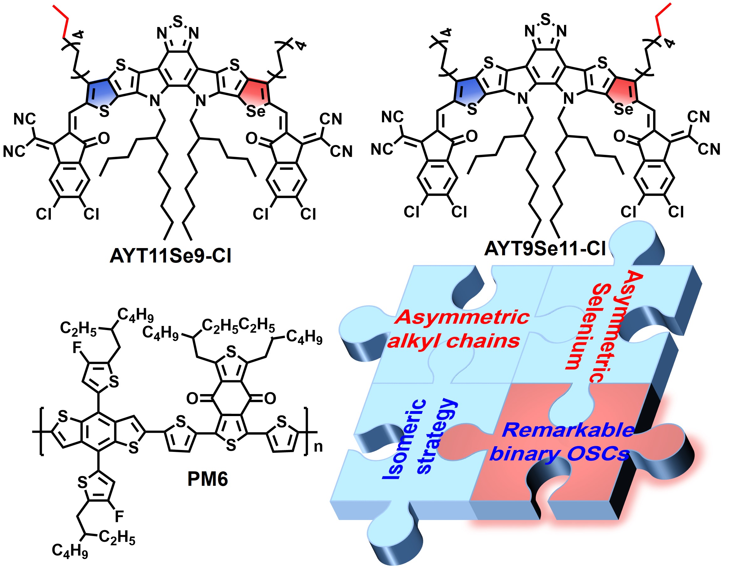 针对上述的关键科学问题,王金亮教授团队在前期硒和异卤原子取代砌块集成的新型单分散受体材料的创制及其在高性能有机太阳能电池中的应用研究工作(Angew. Chem. Int. Ed. 2021, 60, 19241, ESI高被引论文; Angew. Chem. Int. Ed. 2022, 61, e202209454; Energy Environ. Sci., 2021, 14, 3945-3953, 前封面和高被引论文; Energy Environ. Sci., 2022, 15, 320; Energy Environ. Sci., 2021, 14, 90,高被引论文;Adv. Funct. Mater., 2022, 32, 2200807; ACS Energy Lett., 2018, 3, 2967等)的基础上,为了实现更高效率的硒吩类受体材料体系,将基于硒吩的不对称中心核工程和不同的烷基链策略相结合,在不改变烷基链总长度的情况下,最近设计并合成了一对A-D1A’D2-A型双不对称异构体(AYT11Se9-Cl和AYT9Se11-Cl,其具有相同的苯并噻二唑作为A’单元和两个缺电子端基作为A单元,但同时具有两个不同的基于硒吩和噻吩的不对称D1A′D2中心核,并且分别在中心单元中最外侧的硒吩环/噻吩环处连接有n-壬基和n-十一烷基链。系统地探讨了两种不对称区域异构体的光电行为、详细分子间填充的单晶结构、与聚合物给体PM6的共混形态以及相应OSCs的性能的影响。