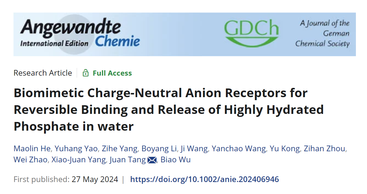 近日,taptap点点体育吴彪教授和唐娟特别研究员团队在仿生电中性阴离子受体与水中高水合磷酸盐的可逆结合和释放方面取得重要进展。相关成果以“Biomimetic Charge-Neutral Anion Receptors for Reversible Binding and Release of Highly Hydrated Phosphate in water”为题发表于国际顶级期刊《Angewandte Chemie International Edition》。taptap点点体育为唯一通讯单位,吴彪教授和唐娟特别研究员为论文通讯作者,taptap点点体育硕士生何茂琳为第一作者。此项研究得到了国家自然科学基金,taptap点点体育青年教师学术启动计划的资助及taptap点点体育分析测试中心的支持,同时福州大学姚宇航老师在理论计算方面给予了大力支持。