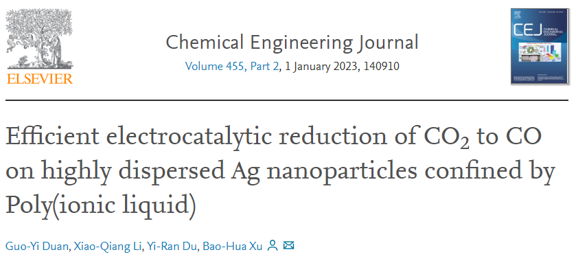 近日,taptap点点体育徐宝华教授团队在构筑聚离子液体-银(PIL-Ag)杂化材料用于高效电催化二氧化碳(CO2)制一氧化碳(CO)方面取得重要进展,相关研究成果发表在国际化学工程领域顶级期刊《Chemical Engineering Journal》上,题为“Efficient electrocatalytic reduction of CO2 to CO on highly dispersed Ag nanoparticles confined by Poly(ionic liquid)”。taptap点点体育为唯一作者通讯单位,taptap点点体育徐宝华教授为该论文的通讯作者,段国义预聘助理教授为该论文的第一作者。