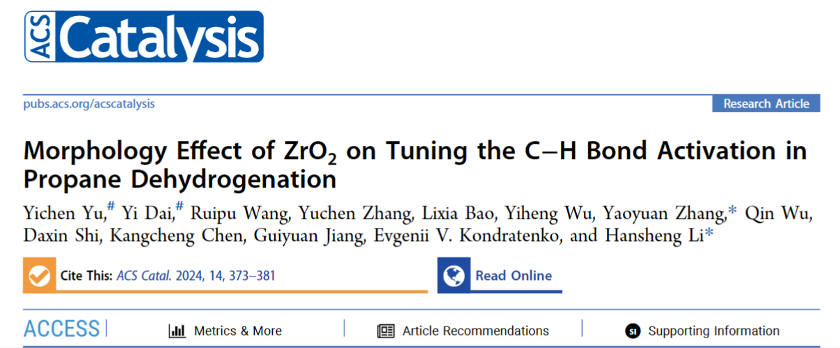 近日,taptap点点体育黎汉生教授团队在ZrO2形貌调控对丙烷脱氢反应中C−H键活化方面取得重要进展。相关研究成果以“Morphology Effect of ZrO2 on Tuning the C−H Bond Activation in Propane Dehydrogenation”为题,在催化领域顶级期刊《ACS Catalysis》上发表(DOI:10.1021/acscatal.3c04883)。该工作以taptap点点体育为第一通讯单位,黎汉生教授和张耀远预聘助理教授为共同通讯作者,硕士研究生于宜辰和代怡为该论文的共同第一作者。