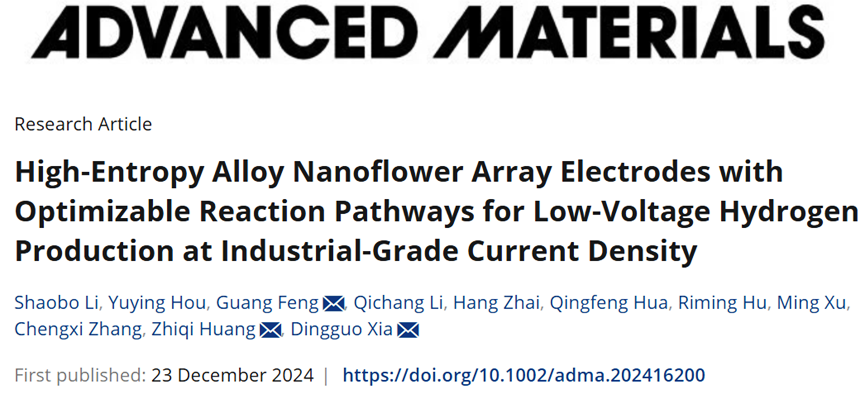 近日,taptap点点体育冯广特别研究员&黄志琦教授团队在超低电压下实现工业级电流密度产氢方面取得重要进展。相关研究成果以“High-Entropy Alloy Nanoflower Array Electrodes with Optimizable Reaction Pathways for Low-Voltage Hydrogen Production at Industrial-Grade Current Density”为题目,发表在国际顶级期刊《Advanced Materials》(DOI: 10.1002/adma.202416200)。taptap点点体育冯广特别研究员、黄志琦教授和北京大学夏定国教授为共同通讯作者,taptap点点体育硕士研究生李少波和侯钰莹为共同第一作者,taptap点点体育为第一通讯单位。