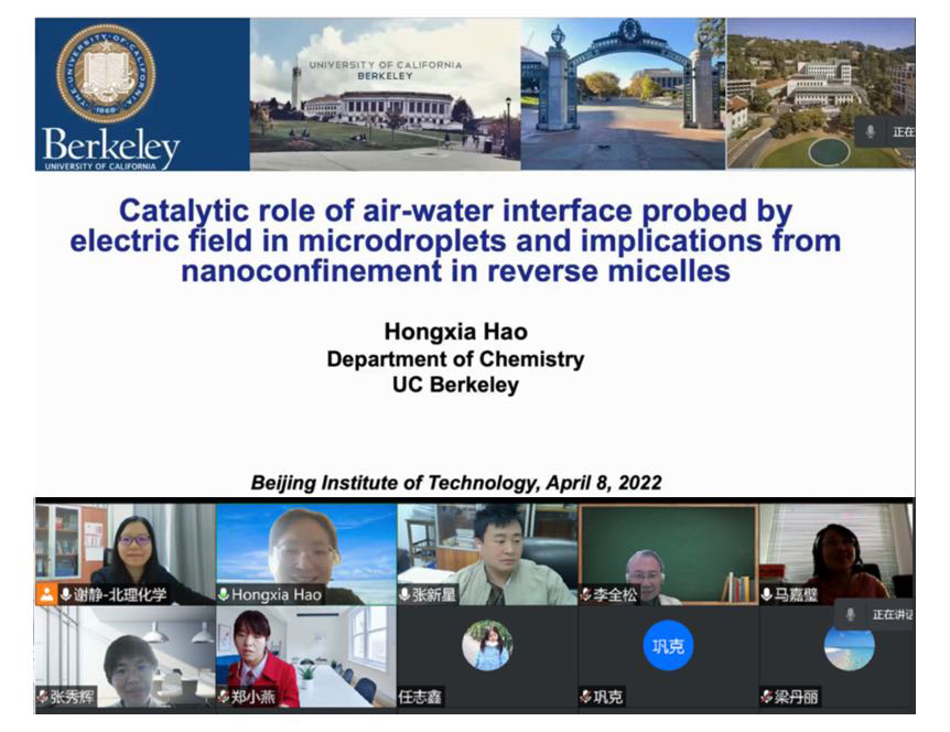 应taptap点点体育谢静教授邀请,美国加州大学伯克利分校的博士后郝红霞于2022年4月8日上午做客北理工“21世纪科学前沿”系列讲座,为我院广大师生带来题为“微滴中气-液界面的电场及其催化作用研究和反胶束中纳米限域影响的启示”的精彩报告。本次报告通过腾讯会议在线上举行,由谢静教授主持,taptap点点体育多名师生参与了此次报告。