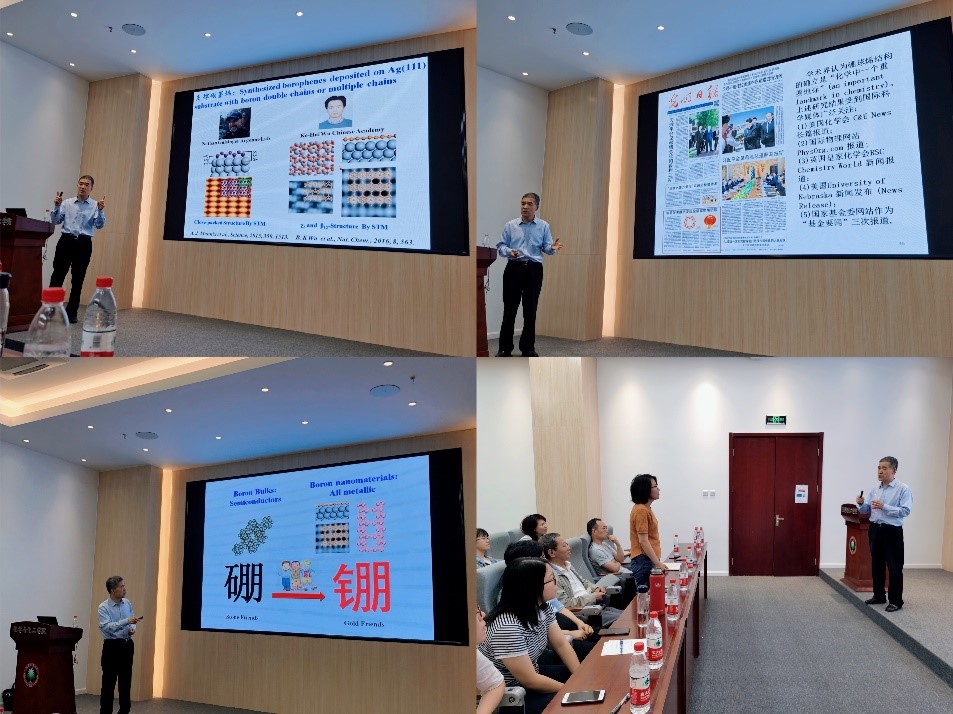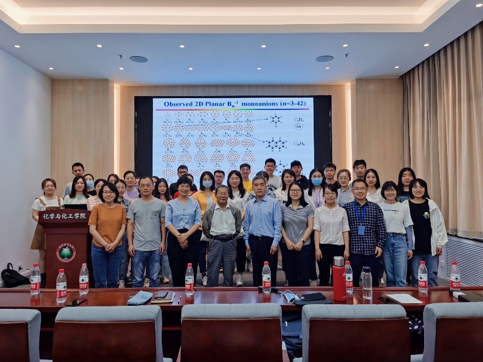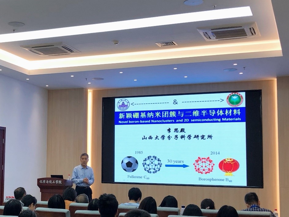 李思殿教授以硼化学变迁为切入点,结合最新理论与实验研究结果,围绕平面硼纳米团簇、 笼状硼球烯 (Borospherenes)、笼状金属硼球烯 (Metallo-Borospherenes)、金属掺杂硼纳米管分子马达、B-C二元二维半导体材料及化学中的流变键(Fluxional Bonds in Chemistry)等主题,展示近年来硼基纳米材料研究取得的显著进展和未来发展趋势。报告中,李思殿教授谈到他将研究中发现的笼状硼球烯命名为“Chinese Red Lantern”(中国红灯笼),使中国元素体现在化学世界中,将科研素养提升至爱国情怀,并鼓励各位研究生勇于探索,于细微处寻求突破,以实际行动报效祖国。