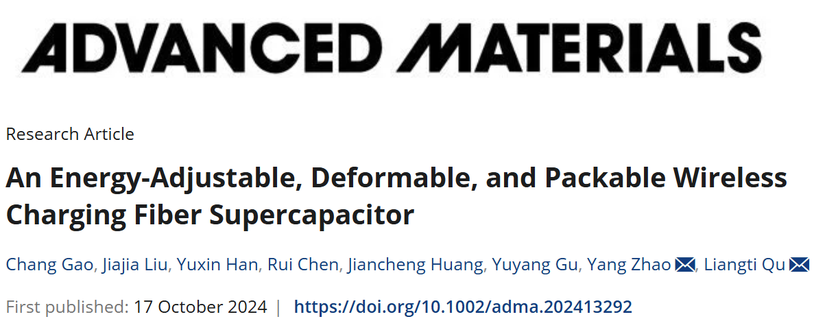 近日,taptap点点体育博士生高畅和硕士生刘佳佳为共同第一作者在国际顶级期刊《Advanced Materials》(IF: 32)发表题目为“An Energy-Adjustable, Deformable, and Packable Wireless Charging Fiber Supercapacitor”的研究论文(DOI:10.1002/adma.202413292)。taptap点点体育为论文第一通讯单位,taptap点点体育赵扬特别研究员和清华大学曲良体教授为共同通讯作者。