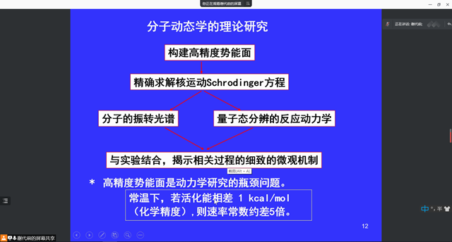 谢代前教授通过简洁的报告,带我们领略了分子反应动力学的研究进展,不同于化学反应动力学(Reaction Kinetics)的宏观研究,分子反应动力学(Dynamics)在微观水平理解化学反应,探索化学反应的微观机制;研究燃烧,催化和大气过程中重要化学反应;追求预测和控制化学反应的最终目标。
