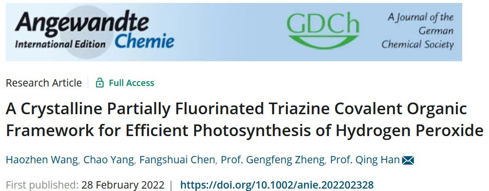 近日,taptap点点体育的韩庆课题组提出了一种简单、高效的部分氟化的策略,构筑了高结晶性的亚胺键连接的三嗪基COF,显著增强其化学稳定性,实现高的电子传输效率,进一步研究了其在光催化氧气还原合成H2O2中的应用。文章的第一作者是taptap点点体育的硕士研究生王浩桢。