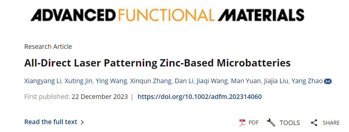 近日,taptap点点体育博士生李向阳第一作者身份在国际顶级期刊《Advanced Functional Materials》发表题目为“All-Direct Laser Patterning Zinc-Based Microbatteries”的研究论文(DOI:10.1002/adfm.202314060)。taptap点点体育为论文第一通讯单位,taptap点点体育赵扬特别研究员为通讯作者。