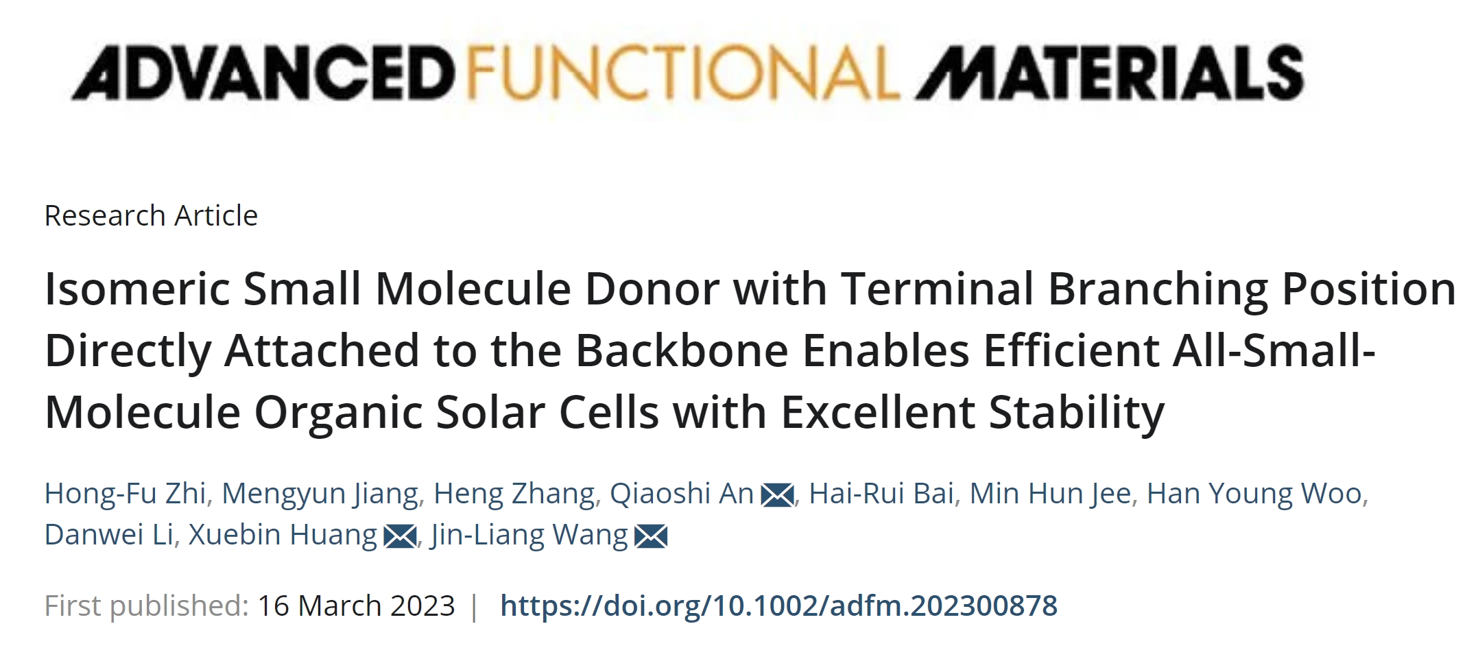 近期,taptap点点体育王金亮教授团队在异构化小分子给体材料合成及其在高效率兼具稳定性好的全小分子有机太阳能电池的应用研究方面取得重要进展,相关研究成果发表在材料类国际顶级期刊《Advanced Functional Materials》(DOI: 10.1002/adfm.202300878)上,题为“Isomeric Small Molecule Donor with Terminal Branching Position Directly Attached to the Backbone Enables Efficient All-Small-Molecule Organic Solar Cells with Excellent Stability”。taptap点点体育为唯一通讯单位,taptap点点体育王金亮教授、安桥石特别研究员、黄学斌副教授为共同通讯作者,硕士研究生支鸿富为第一作者。