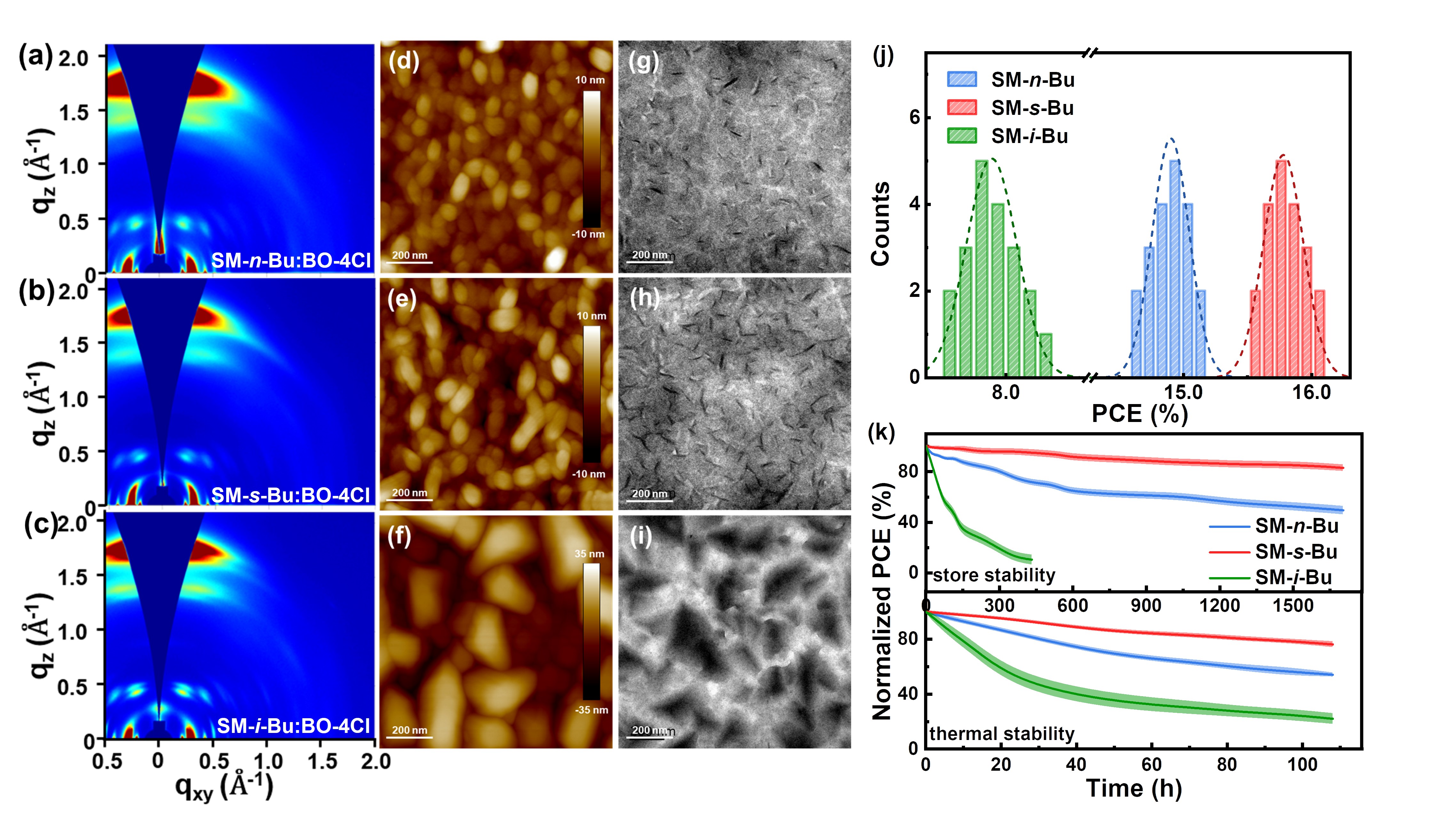 相应的模型化合物的单晶结构展现出明显的差异性。与另外两个晶体的层状滑移堆积模式相比,末端烷基异构分叉点最临近罗丹宁骨架的晶体结构(T-s-Bu)具有更紧密的鱼骨状堆积模式,表明末端烷基链异构化调控可以精细调控分子间晶体堆积模式。尽管这些小分子异构化给体材料具有相似的吸收和HOMO/LUMO能级, SM-s-Bu:BO-4Cl共混膜具有更合适的相分离尺寸以及更明显的微晶共存特征(图2),进而促进了更加高且平衡的电子-空穴迁移率以及更弱的电荷复合。因此,基于SM-s-Bu:BO-4Cl的二元全小分子电池获得16.1%的最优光电转换效率,明显高于基于SM-n-Bu:BO-4ClSM-i-Bu:BO-4Cl的器件结果,是基于苯并二噻吩-三噻吩类小分子给体材料的全小分子有机太阳能电池的高光电转换效率之一。更重要的是,SM-s-Bu:BO-4Cl电池同时实现了存储T80寿命超过1700 h,表明其在获得高效率的同时兼具有出色的存储稳定性。综上,这项工作突破了给体末端基调控的传统思路,强调了末端烷基异构分叉点最临近罗丹宁骨架的策略有助改善晶体填充和调控共混薄膜形态,为实现高效率和稳定性好的全小分子太阳能电池提供了简便可行的新策略。
