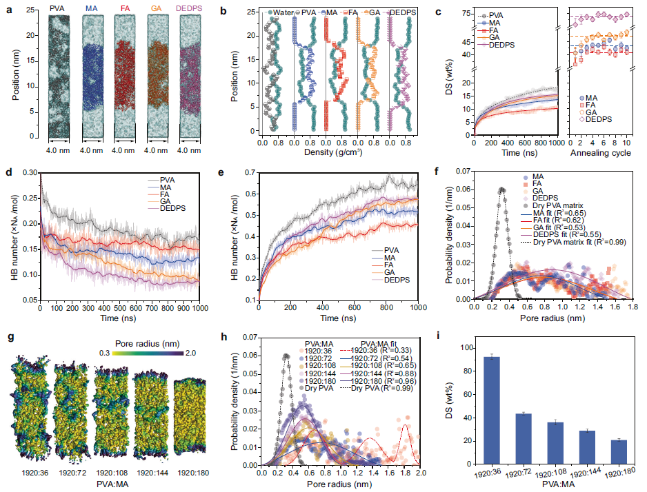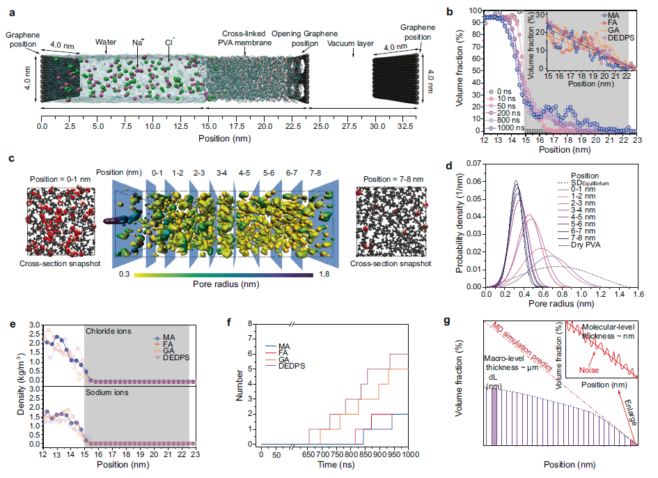 如图2a和b所示,交联能够显著抑制PVA薄膜在水溶液中的溶胀,从而在水溶液及PVA之间形成清晰的相界面。对膜内氢键数的动态分析表明,水分子塑化PVA的过程伴随有其对PVA链间氢键的破坏(图2c、d和e)。水分子对PVA强烈的塑化效应导致了孔径分布的均值和方差皆显著增大,膜内部分微孔转变为介孔(图2f)。