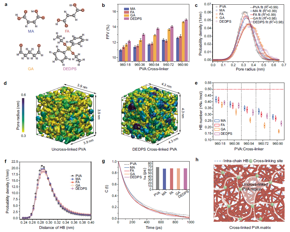 如图1b和c所示,在PVA分子链间的分别引入四种(马来酸,富马酸,戊二醛,二乙氧基二苯基硅烷)交联剂,皆使PVA膜的自由体积分数(孔隙率)增加,且孔隙尺寸略微增大。通过分析PVA膜内氢键网络的性质可知,交联能够显著抑制PVA分子链间氢键的形成(图1e),但对氢键键长及氢键寿命的影响有限(图1f和g)。由此推测,上述膜内孔隙结构的变化仅发生在交联位点处。