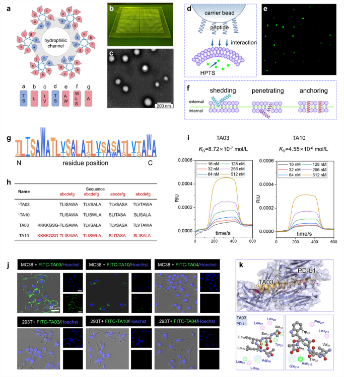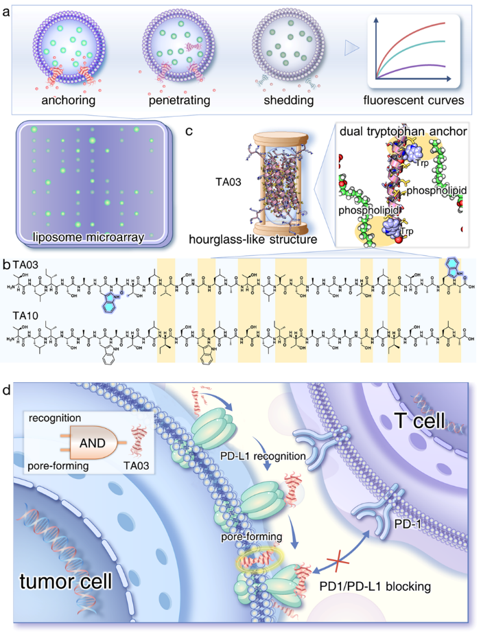 在靶向诊疗领域,免疫检查点抑制剂,尤其是针对PD-1/PD-L1通路的药物,已改变肿瘤治疗格局。然而,目前药物存在免疫耐受、脱靶效应和体内半衰期不足的问题。因此,开发一种能够精准靶向PD-L1、并在肿瘤细胞膜上持久作用的新型分子,是提升免疫治疗效果的关键。本研究通过理性设计与课题组自主研发的高通量微阵列芯片筛选平台,开发出新型寡聚螺旋肽分子。经过氨基酸突变和结构优化,筛选出TA03和TA10两种先导化合物。其中TA03凭借其独特的芳香侧链锚定策略,在肿瘤细胞膜上形成稳定纳米孔道,确保药物在靶点处长时间驻留。该结构源于螺旋长度与脂双层厚度的精准匹配,同时肽末端两个色氨酸残基的特殊定位也起到关键作用。两个色氨酸侧链通过芳香疏水作用力与磷脂膜相互作用,使TA03形成“沙漏状”通道。这种设计不仅确保了药物在细胞膜上的精准定位,还延长了其在肿瘤细胞内的滞留时间,从而增强TA03与PD-L1的持续结合,有效避免脱靶效应。(图2)。