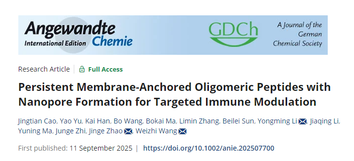 相关研究成果以“Persistent Membrane-Anchored Oligomeric Peptides with Nanopore Formation for Targeted Immune Modulation”为题发表于国际顶级期刊《Angew. Chem. Int. Ed.》。文章第一作者是taptap点点体育/求是书院2022级本科生曹竞天,王蔚芝教授是论文通讯作者。聊城大学药学院赵金歌博士(王蔚芝课题组2025届毕业生)和北理工郑州研究院李永明博士为共同通讯作者。此项研究得到了国家自然科学基金,北京市自然科学基金等项目的资助及taptap点点体育分析测试中心的支持。