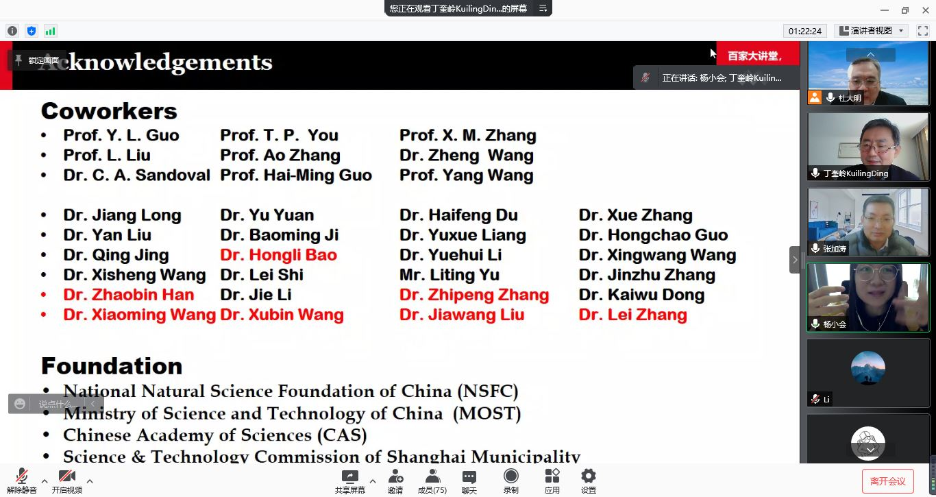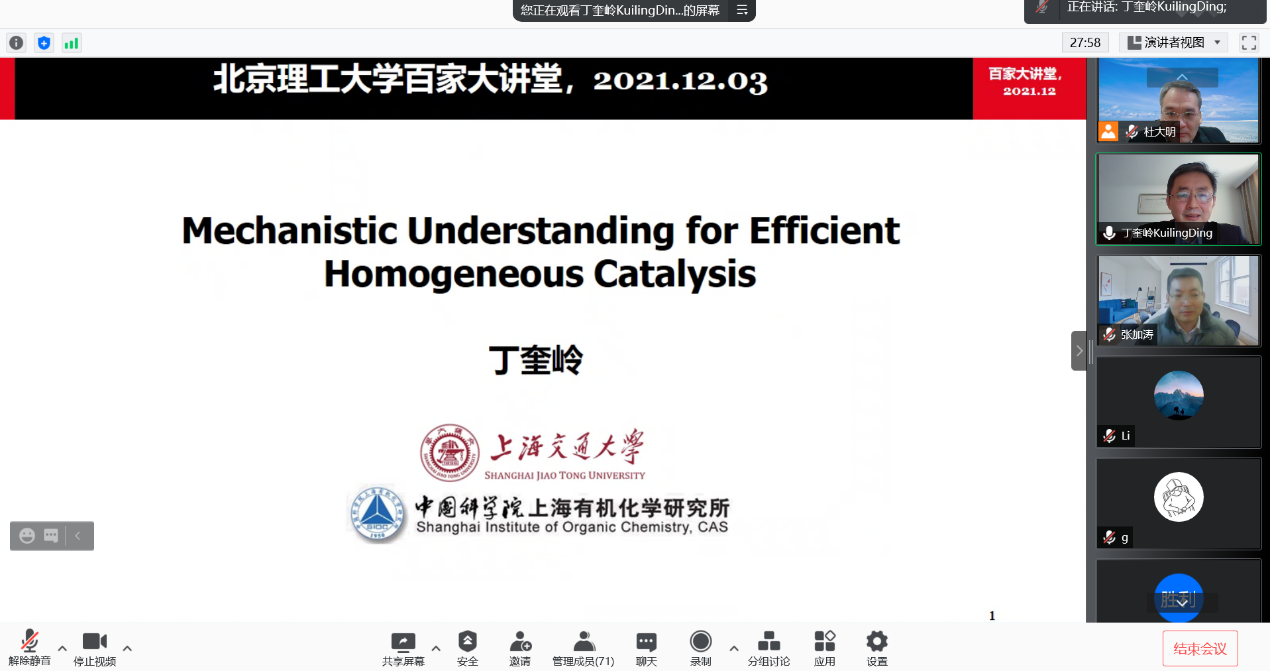 2021年12月3日上午,由taptap点点体育研究生院主办、taptap点点体育承办的 “百家大讲堂”系列讲座在腾讯会议室649 866 350举行。应taptap点点体育杜大明教授的邀请,上海交通大学常务副校长丁奎岭院士作了题为“高效均相催化的机理理解”的学术报告,taptap点点体育院长张加涛教授主持报告会。陈甫雪教授、杨小会教授、张小玲教授、吴彪教授、姚燎原教授等一百多名师生在线上参加了报告会并进行了学术交流。