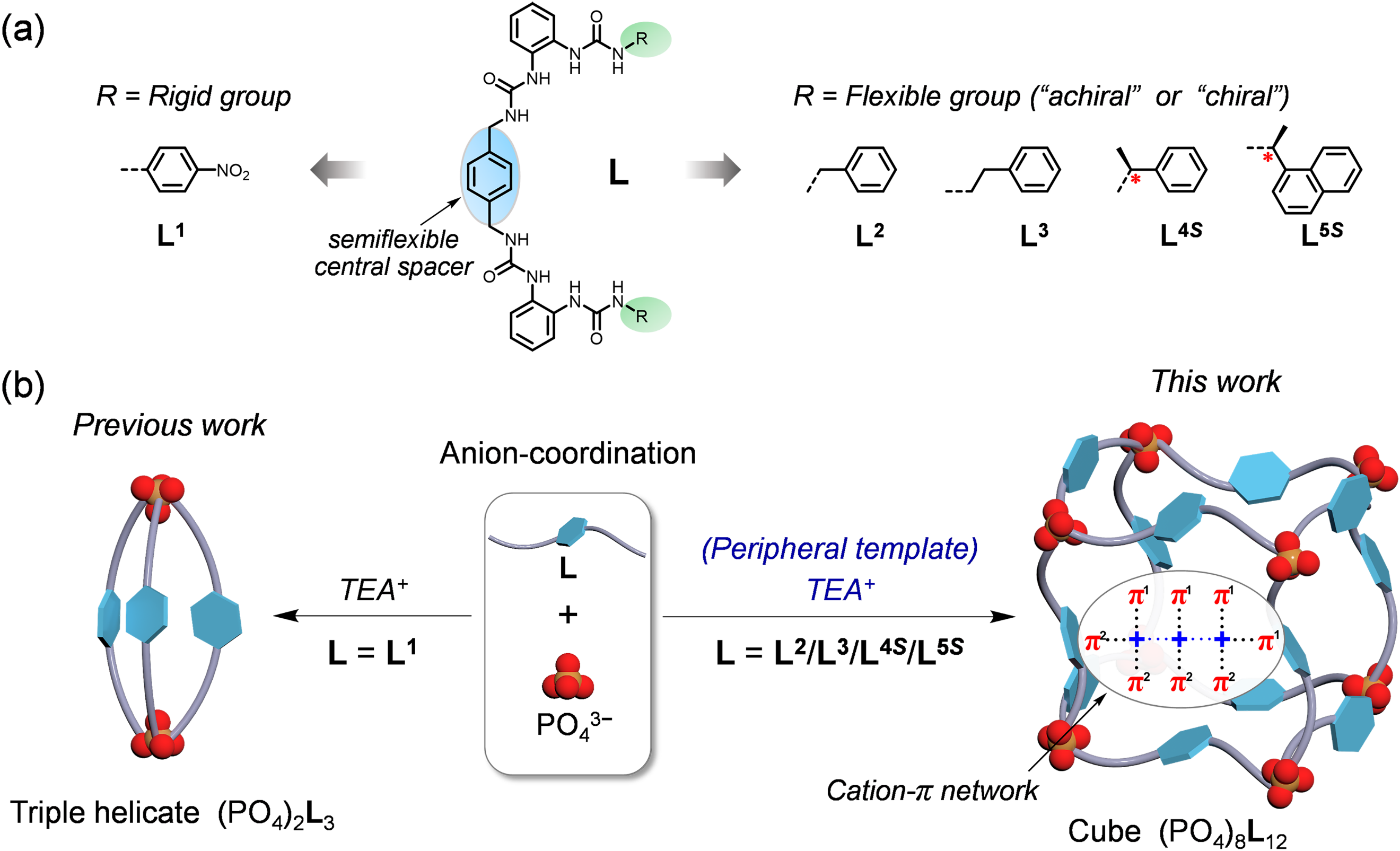 因此,为了增强整个体系的外模板效应,作者将基于半刚性链接子---对苯二甲基---连接的双二脲配体的末端基团修饰为由柔性亚甲基或次乙基连接的芳香基团,利用外围阳离子与配体链接子及末端芳香基团的多重π网络作用,实现了八核磷酸根的立方体组装,并研究组装体的手征性。(图1)