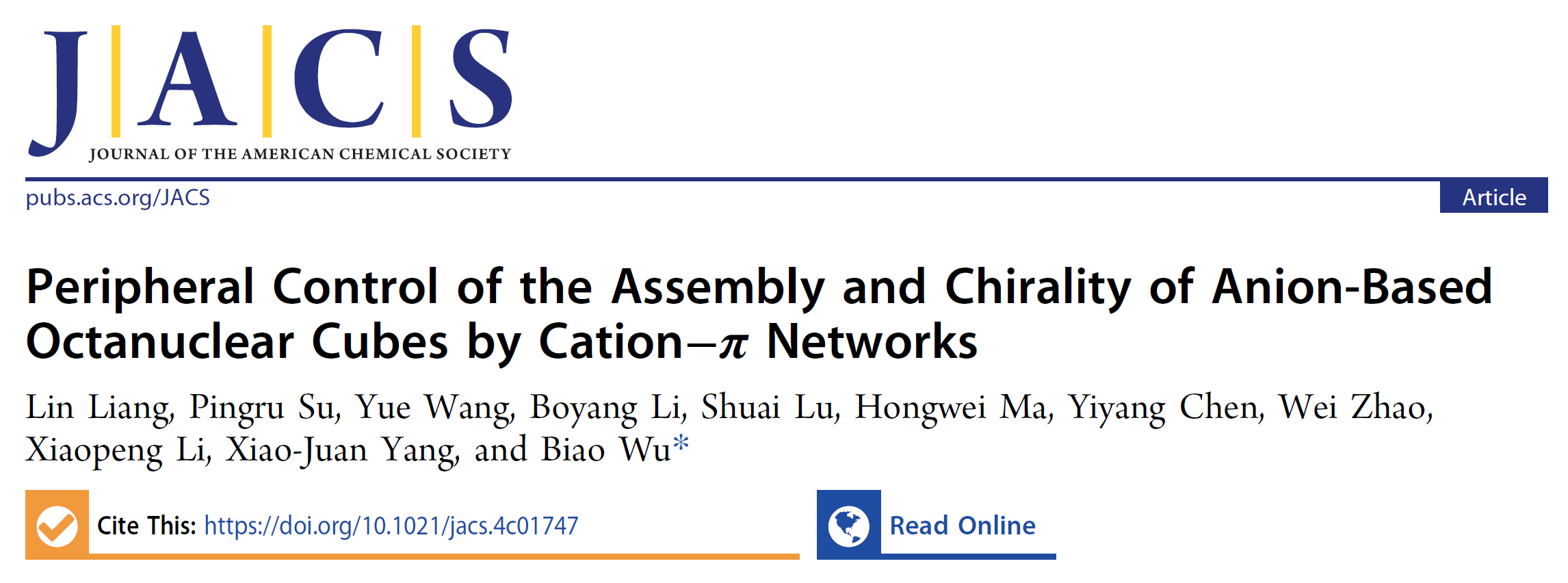 近日,taptap点点体育吴彪教授团队在阴离子配位超分子组装方面取得重要进展,合成了首例以阴离子为配位中心的八核立方体笼,其外围阳离子−π作用网络决定了笼化合物的稳定性及手征性。相关研究成果以“Peripheral Control of the Assembly and Chirality of Anion-Based Octanuclear Cubes by Cation-π Networks”为题发表于国际顶级期刊《Journal of the American Chemical Society》。taptap点点体育为第一通讯单位,吴彪教授为论文通讯作者,taptap点点体育博士生梁林为论文第一作者。此项研究得到了国家自然科学基金,北京市自然科学基金等项目的资助及taptap点点体育分析测试中心的支持,同时深圳大学苏平如博士、卢帅博士和李霄鹏教授在高分辨质谱方面给予了大力支持。