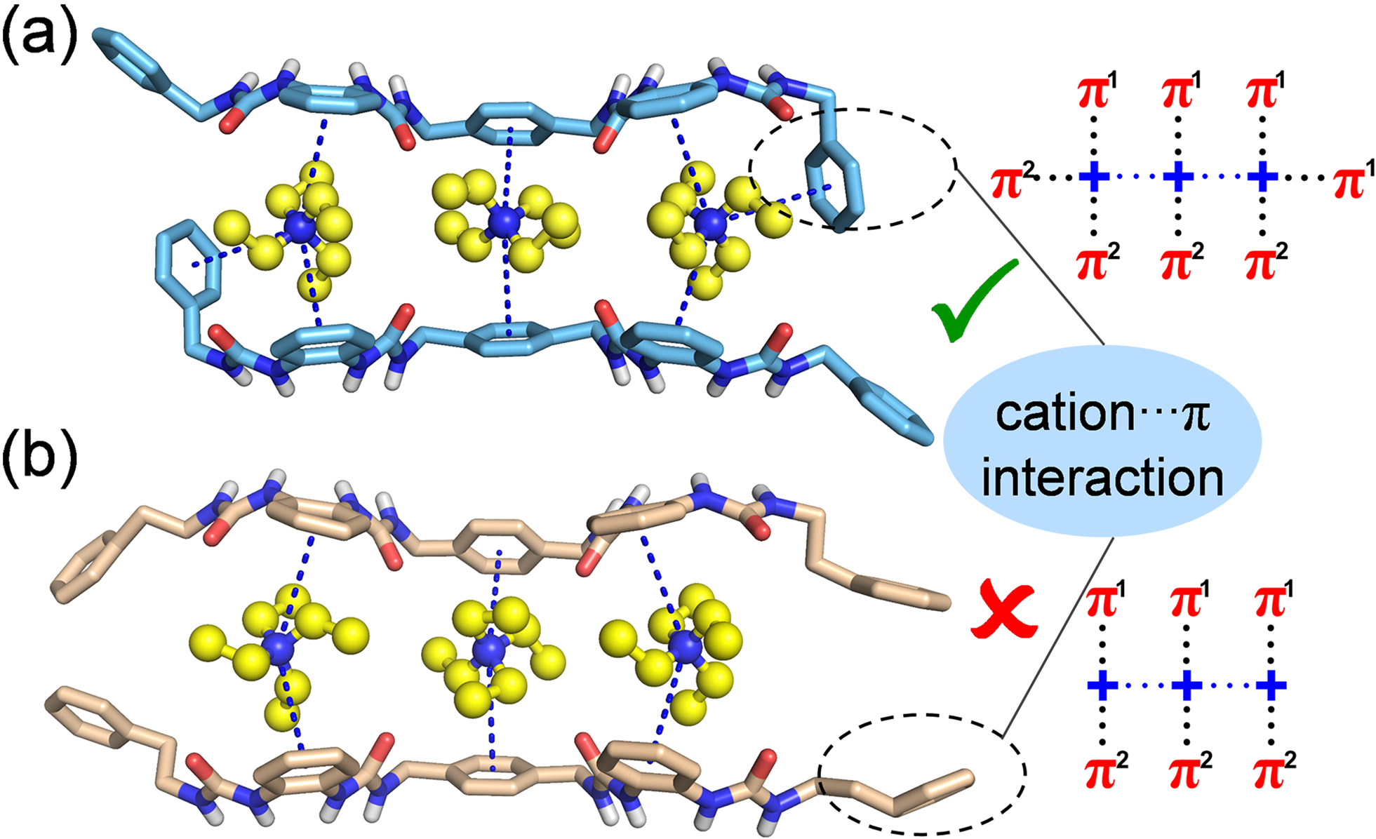 图3. 立方体面上的阳离子−π网络对比(a)立方体C-L2-TEA(末端苯环参与阳离子−π作用并折叠);(b) 立方体C-L3-TEA(末端苯环未参与阳离子−π作用并且未发生折叠,从而难以保护每个面上的阳离子−π网络免受溶剂效应的破坏,最终导致该结构在溶液中解离)。