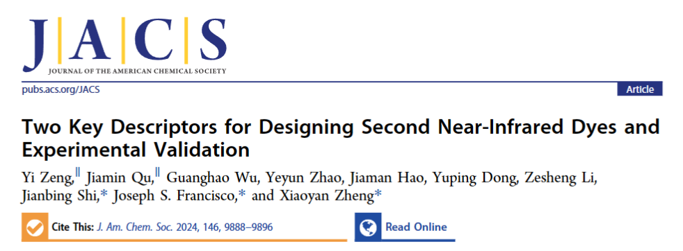 近日,taptap点点体育郑小燕副教授和材料学院石建兵副教授,与美国宾夕法尼亚大学Francisco教授合作,在近红外二区(NIR-II)荧光染料理论设计方面取得重要进展。相关成果以“Two key descriptors for designing second near-infrared dyes and experimental validation”为题发表于国际顶级期刊《Journal of the American Chemical Society》。taptap点点体育为第一通讯单位,曾怡和屈佳敏两位博士生为共同第一作者,郑小燕、石建兵和Francisco教授为共同通讯作者,李泽生教授和董宇平教授对本工作给予了重要指导。