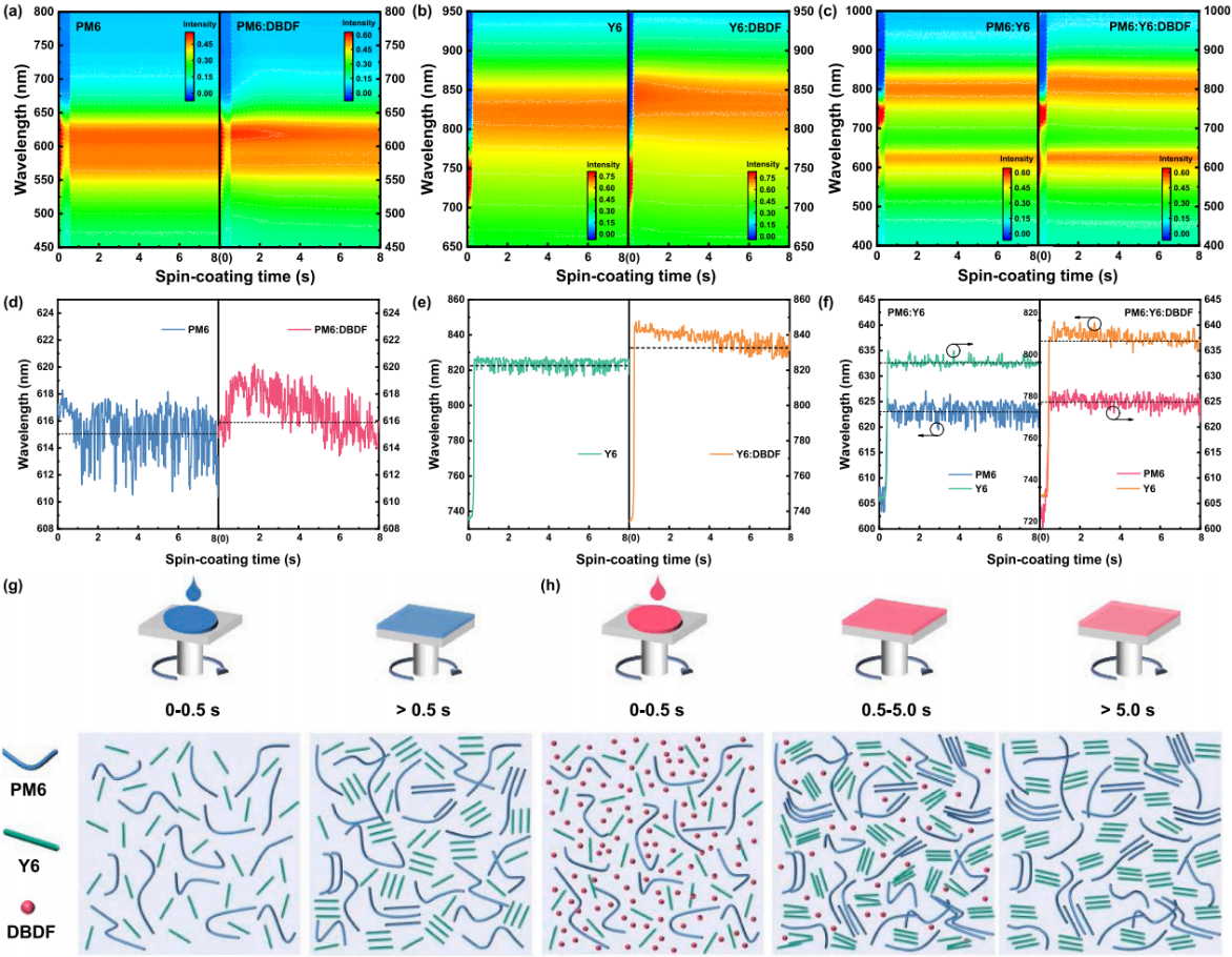 成膜动力学与形貌研究证明表明,在无需额外前/后处理工艺的条件下,DBDF在旋涂过程中能够完全原位挥发(图2),进而诱导活性层形成更优的分子堆积和给受体垂直相分离结构,从而促进器件中电荷的高效生成与提取。此外,有序的分子堆积使给体和受体的吸收光谱发生红移,有利于捕获更多光子,进一步增强了电荷生成效率。以经典PM6:Y6为活性层,基于DBDF的OSCs无需额外工艺优化即实现了18.1%的优异PCE,且展现出优异的稳定性,显著优于对比器件。此外,在D18:N3:Y6-1O体系中引入DBDF后,铸态器件获得了20.2%的PCE,其性能媲美文献中基于各种复杂工艺的器件。值得注意的是,后续热退火处理因增加电压损失而对性能提升作用甚微。这项工作提出了一种简化器件制备工艺的巧妙策略,为推动低成本商业化生产OSCs的发展提供了新思路。