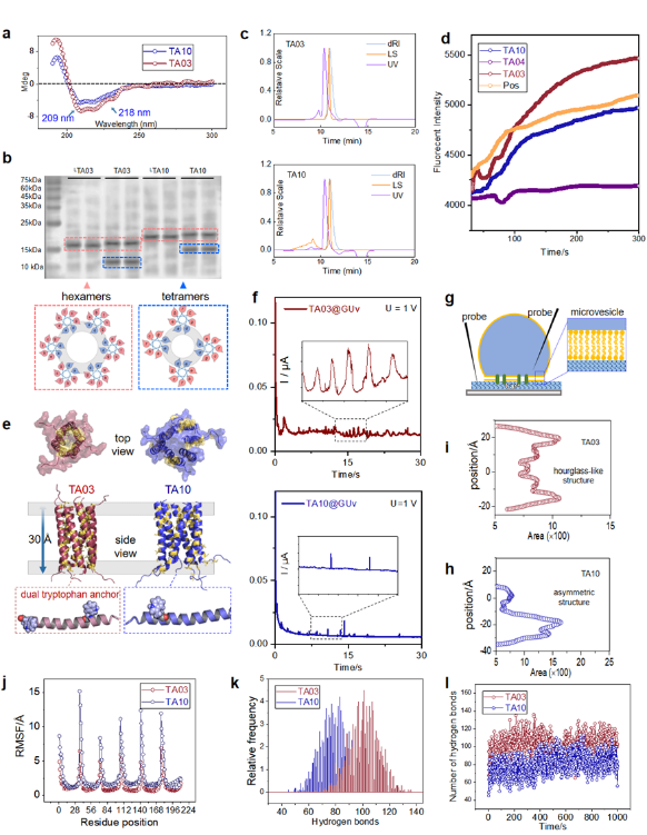 结构和功能实验表明,两种肽均呈现典型的α-螺旋结构,可通过自组装形成孔道状寡聚螺旋体。螺旋结构的两面性使肽能够与膜脂肪酸尾部疏水作用,并通过氢键与磷脂头部或水相相互作用,有助于嵌入膜并稳定孔道。同时,螺旋的柔性有助于适应膜的流动性。电泳和光散射分析表明,未修饰的LTA分子主要以六聚体存在,而加了亲水端头的TA分子则表现为六聚体和四聚体的混合。荧光脂质体实验表明,TA03和TA10能显著提升脂质体荧光信号,且TA03的成孔能力更强、更持久(图4)。在体内疗效方面, TA03与 TA10 均表现出抑瘤效应,但 TA03 的疗效更为显著,所有处理组未见明显体重下降或毒性表现,显示出良好的生物相容性与安全性。