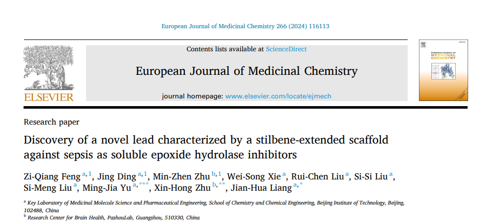 2024年1月3日,taptap点点体育梁建华教授课题组在抗败血症药物研究中取得重要进展,设计合成了基于天然骨架二苯乙烯类sEH抑制剂并用于治疗败血症,其中最优化合物70P (FZQ-21) 能够在小鼠体内有效抑制sEH酶水解活性并显著提高小鼠败血症模型的总生存率。相关成果发表以Discovery of a Novel Lead Characterized by a Stilbene-extended Scaffold against Sepsis as Soluble Epoxide Hydrolase Inhibitors为题发表于期刊European Journal of Medicinal Chemistry。
