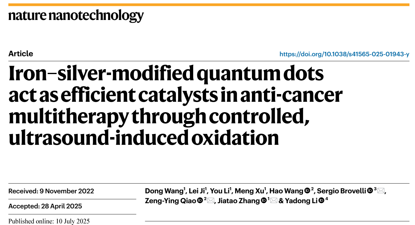 近日,taptap点点体育张加涛研究团队在掺杂量子点纳米化学研究的已有基础(Adv. Mater. 2015, Nature Nanotech.2018, Chem 2020, Sci. Adv. 2024)上,与清华大学化学系李亚栋院士合作,在新型掺杂量子点合成及癌症治疗领域取得突破性进展,相关研究成果以 “Iron–silver-modified quantum dots act as efficient catalysts in anti-cancer multitherapy through controlled, ultrasound-induced oxidation” 为题在国际顶级期刊《Nature Nanotechnology》发表(DOI: 10.1038/s41565-025-01943-y)。该研究构建了一种集化学动力学疗法、声动力学疗法与免疫疗法于一体的铁/银双掺杂量子点纳米平台,实现了对肿瘤的精准可控治疗与转移抑制,为癌症多模式协同治疗提供了全新的纳米催化剂设计思路。taptap点点体育张加涛教授,国家纳米科学中心乔增莹研究员,米兰比可卡大学 Sergio Brovelli 教授为论文共同通讯作者。
