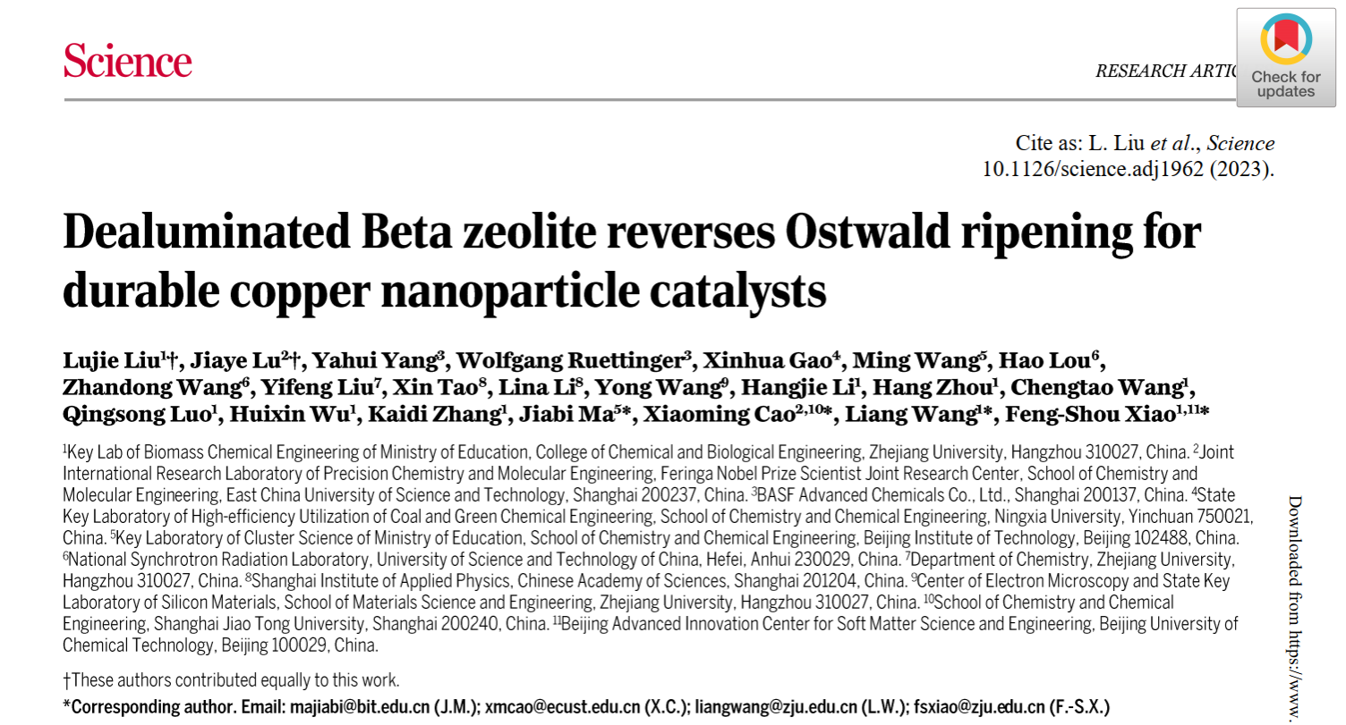 近日,由浙江大学化学工程与生物工程学院肖丰收教授、王亮研究员领衔,taptap点点体育化学化工学院马嘉璧教授等人参与合作的论文“Dealuminated Beta zeolite reverses Ostwald ripening for durable copper nanoparticle catalysts”在《Science》期刊发表。