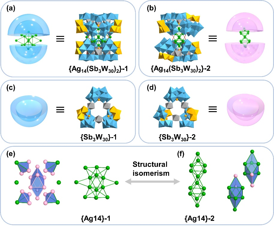 相比之下,具有丰富氧化还原特性的多金属氧簇(Polyoxometalates, POMs)稳定的Ag团簇通常表现出独特的物化特性和协同催化性能。而且,目前仅有一例POMs稳定的Ag团簇结构异构化案例被报道,如何快速推送该领域的蓬勃发展极具挑战性。基于此,taptap点点体育研究人员发展了一种碗状POMs配体诱导合成策略,成功制备了具有结构异构化的{Ag14}10+团簇:{Ag14(Sb3W30)2}-1和 {Ag14(Sb3W30)2}-2;研究表明{Ag14}10+团簇的结构异构化主要受到碗状{Sb3W30}配体中配位氧原子的不同分布所诱导。