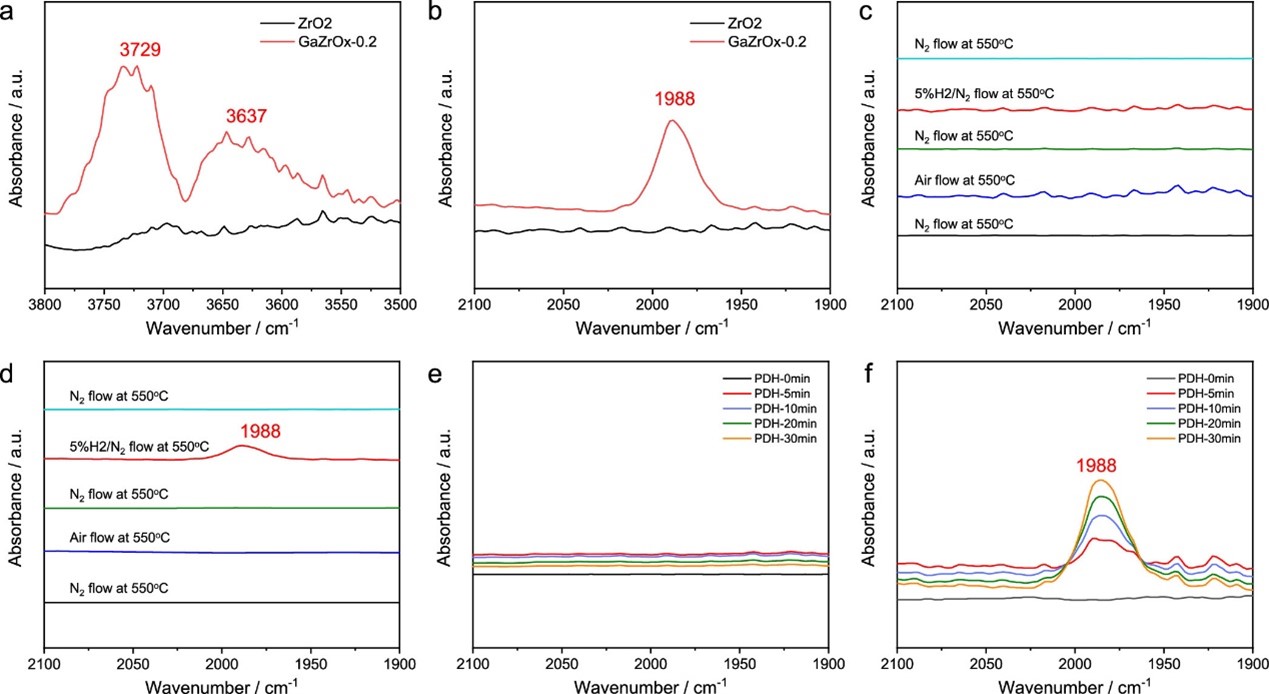 为了阐述GaZrOx催化剂在PDH中的反应中间体和催化机理,采用原位红外(in situ DRIFTS)和DFT计算对代表性的ZrO2和GaZrOx−0.2催化剂进行研究。In situ DRIFTS结果表明,GaZrOx−0.2在1988 cm-1出现归属于Ga-H物种的振动峰,说明Ga原子会参与到PDH反应过程,且该振动峰强度随反应时间的增加而增加,表明Ga−H物种持续生成并积累,而在ZrO2上没有观察到类似的信号。DFT计算结果表明,在ZrO2中掺杂Ga使得丙烷脱氢反应中C−H键的活化方式由逐步机制变为协同机制,降低了C-H键的活化能垒,Ga−O−Zr−O结构是GaZrOx催化剂PDH活性位点,具有更高的PDH本征活性,与实验结果相一致。此处所展现的通过金属掺杂调控金属氧化物催化剂C−H键活化能力的策略同样适用于其它催化体系中。