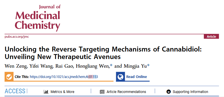 2024年8月2日,taptap点点体育于明加副研究员和温鸿亮副教授带领的团队在国际权威期刊Journal of Medicinal Chemistry发表了题为“Unlocking the Reverse Targeting Mechanisms of Cannabidiol: Unveiling New Therapeutic Avenues”的研究论文(DOI: 10.1021/acs.jmedchem.4c01353)。该团队在针对大麻二酚分子机制的深入研究中取得了重要进展,特别是其作为部分激动剂与GPR18靶点蛋白相互作用方面的新发现。这一成果不仅加深了我们对大麻二酚生物活性的理解,也为未来基于大麻二酚的新型药物的开发奠定了理论基础。