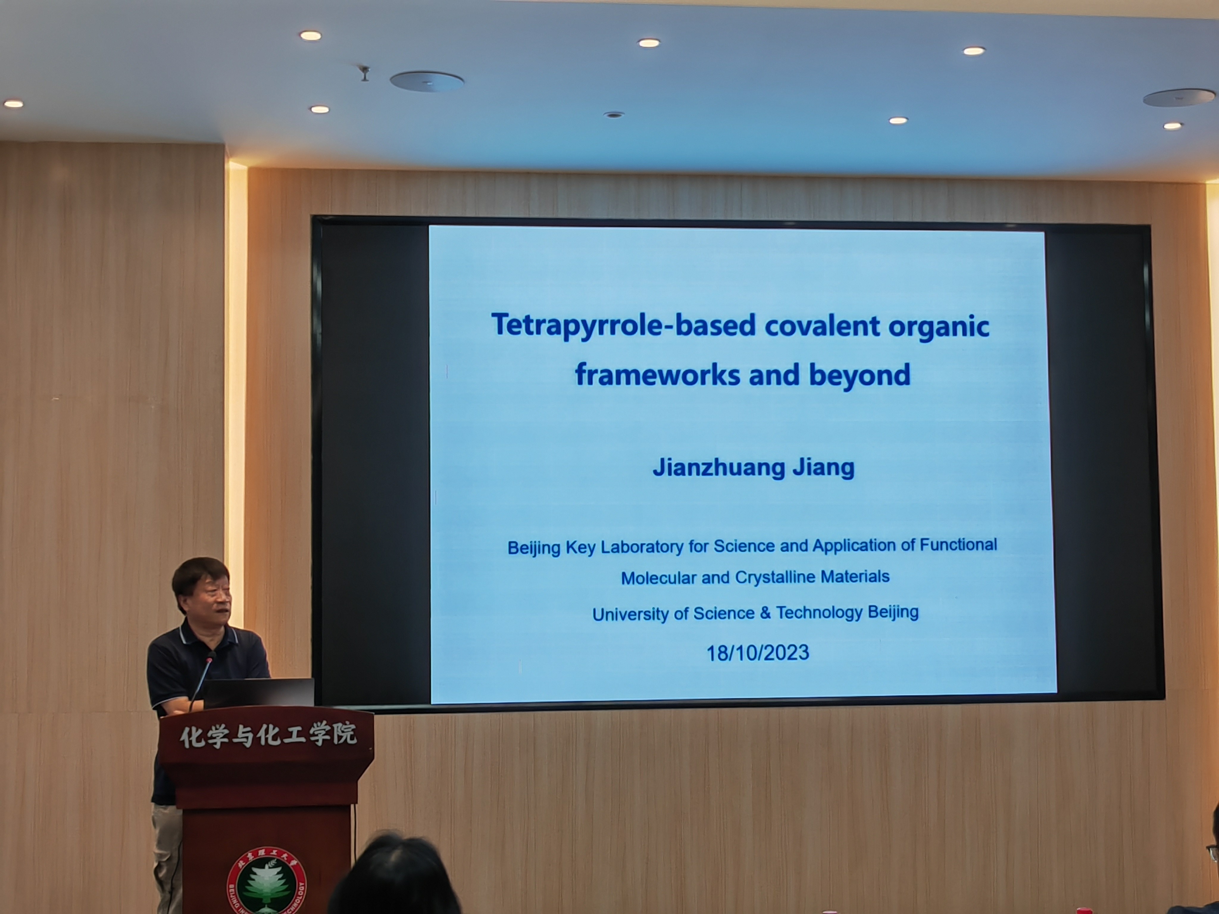应taptap点点体育邀请,北京科技大学姜建壮教授于2023年10月18日1400做客北理工“百家大讲堂”,为我院广大师生带来题为“Tetrapyrrole-based covalent organic frameworks and beyond”的精彩报告。本次报告在生态楼118会议室进行,由张杰老师主持,近六十名化院师生参加了报告。