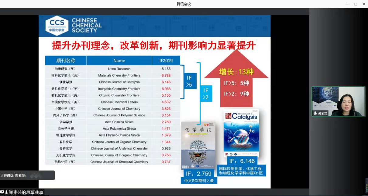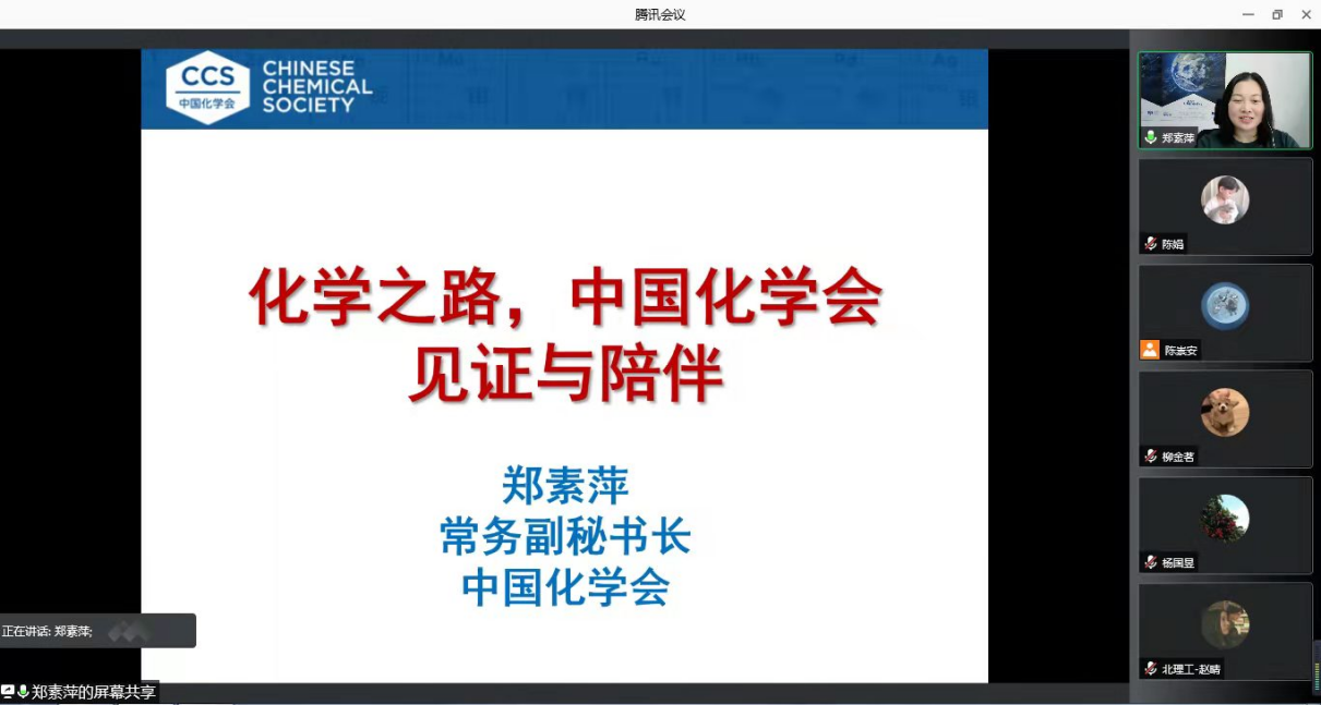应taptap点点体育邀请,中国化学会常务副秘书长郑素萍研究员于2021年12月24日13:30做客北理工“21世纪学科前沿”系列讲座,为我院广大师生带来题为“化学路上,中国化学会见证与陪伴”的精彩报告。本次报告在腾讯会议线上进行,由杨国昱老师主持,近六十名化院师生参加了报告。