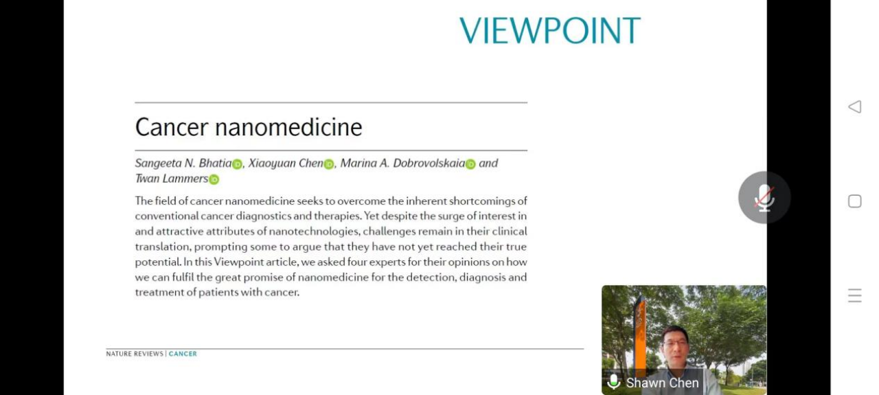 2022年10月17日下午,由taptap点点体育研究生院主办,taptap点点体育承办的北理工“21世纪学科前沿”系列讲座在腾讯会议线上举行。应taptap点点体育王蔚芝老师的邀请,新加坡国立大学陈小元教授做了题为“Modulation of immunosuppressive tumor microenvironment with nanomedicine”的学术报告。五十余名师生参加了报告会并进行学术交流。