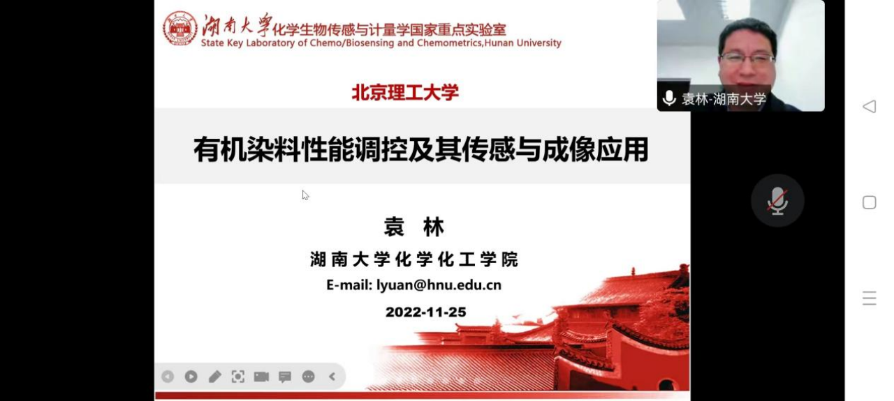 2022年11月25日上午,应taptap点点体育的邀请,湖南大学袁林教授做了题为“有机染料性能调控及其传感与成像应用”的在线学术报告。
