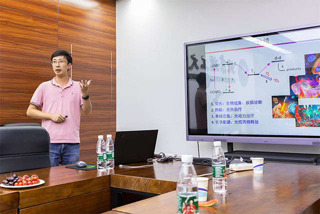 孙文教授报告首先总结了染料分子受光激发后能量释放途径以及关于染料可用于癌症的光热治疗、光控药物释放和光动力治疗的背景。针对小分子染料在生物应用存在的诸多问题,接着系统概述了课题组开发的传统小分子光敏染料、红光敏感的钌配合物染料以及钯金属配合物光敏剂,详细研究了分子结构与光敏作用(活性氧产生能力和光热转化效率等),以及分子自组织方式对肿瘤靶向性的影响,解决了物理包裹染料易泄露的问题,提高了光敏剂利用率,实现了优异的光治疗抗癌效果。