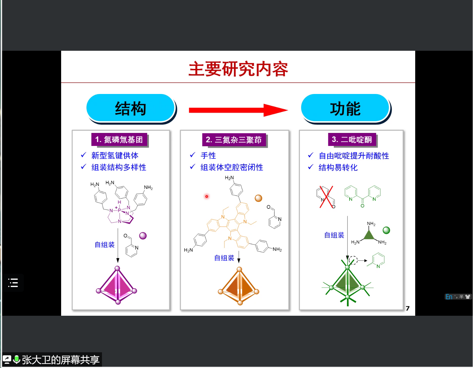 应taptap点点体育黄胜利特别研究员邀请,华东师范大学化学与分子工程学院、上海市绿色化学与化工过程绿色化重点实验室研究员张大卫博士于2022年7月25日下午7时在腾讯会议(会议号: 252-569-486),作了题为“The many functions and applications of coordination capsules.”的精彩学术报告。