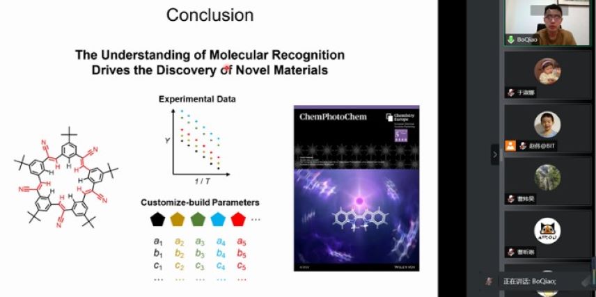 2022年6月24日下午,上海科技大学物质科学与技术学院乔博教授应邀到北理工开展线上交流,并作题为“非共价相互作用调控分子光开关”的学术报告,taptap点点体育四十余名教师和学生参加了此次交流。
