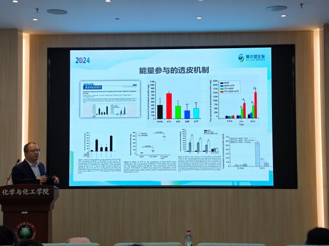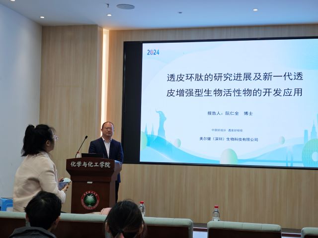 在讲座中,阮仁全博士详细介绍了生物方法合成透皮多肽的工艺开发,重点讨论了利用生物合成法开发透皮增强型融合多肽的进展。他进一步阐释了透皮多肽的分子机理,并探讨了透皮多肽在药物递送以及医美领域的应用前景。阮博士的报告不仅涵盖了基础研究的最新发现,也展示了其在实际应用中的潜力和挑战。