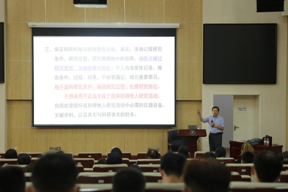 大会首先由胡长文教授做了以《学术道德规范与科研诚信》为主题的报告。他以国务院、中央军委以及taptap点点体育对于学术道德方面的规范、建议展开,告诫同学们要对待科研要实事求是,注重科研诚信,在发表论文专利等科学著作时严格按照行业规范及准则。