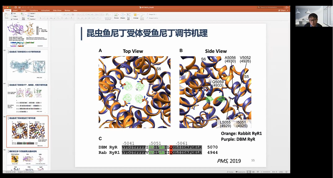 尉迟教授深入介绍了离子通道这一重要靶标在心脏和神经系统疾病方面的应用以及昆虫离子通道的研究进展,并着重阐述了鱼尼丁受体作为杀虫剂靶标的研究应用。尉迟教授第一部分从杀虫剂作用原理出发,首先介绍了鱼尼丁受体作为细胞内信号整合器可以控制肌肉收缩,其次通过冷冻电镜解析了主流杀虫剂、候选杀虫化合物与鱼尼丁受体结合的复合物蛋白结构,从而揭示了双酰胺激活鱼尼丁受体的分子机制—双酰胺结合诱导Arg4563构象变化;随后第二部分介绍了杀虫剂产生抗药性的机制即新发现的鱼尼丁受体抗性突变对靶标结构和功能的影响及其发生规律;第三部分介绍了针对鱼尼丁受体靶标的高通量筛选方法—基于内质网钙离子荧光的杀虫剂筛选,该方法通量高、成本低、选择性高、信噪比高。最后介绍杀虫剂的开发可以利用杀虫剂复合物结构和抗性鱼尼丁受体结构开发针对新一代鱼尼丁受体靶标的绿色杀虫剂。