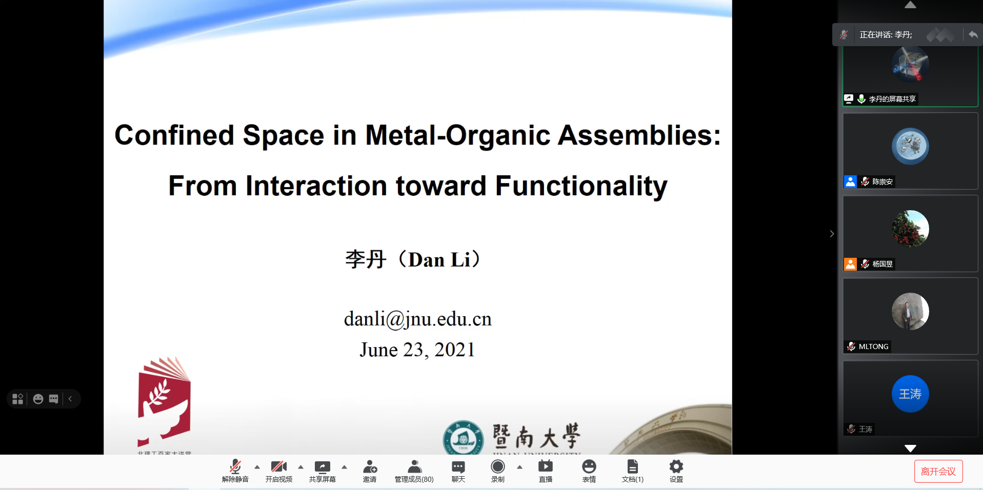 应taptap点点体育邀请,暨南大学李丹教授于2021年6月23日15:00做客北理工“百家大讲堂”,为我院广大师生带来题为“Confined Space in Metal-Organic Assemblies: From Interaction toward Functionality”的精彩学术报告。本次报告在腾讯会议平台线上进行,由杨国昱老师主持,近百名化院师生参加了报告。