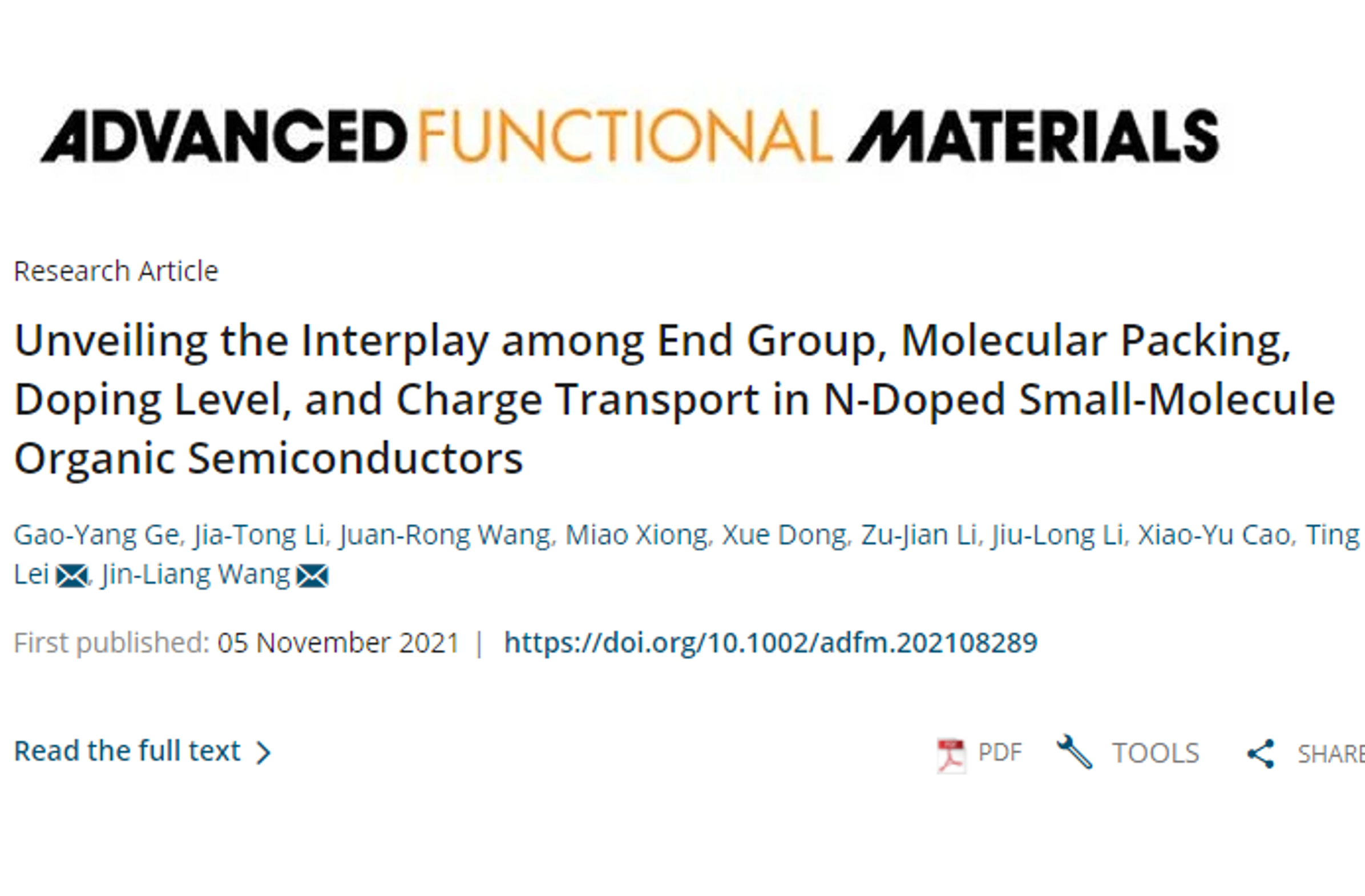 相关成果以“Unveiling the Interplay among End Group, Molecular Packing, Doping Level, and Charge Transport in N-Doped Small-Molecule Organic Semiconductors”为题,发表在国际材料顶级期刊《Advanced Functional Materials》(2021, 31, 2108289)上。taptap点点体育博士生葛高阳和北京大学材料科学与工程学院博士生李佳桐为该论文的共同第一作者,taptap点点体育王金亮教授和北京大学雷霆研究员为共同通讯作者,论文的合作者还包括厦门大学的曹晓宇教授。该研究工作得到了国家自然科学基金面上项目、国家海外高层次青年人才计划、taptap点点体育特立青年学者计划等项目的资助,以及北京市光电转换材料重点实验室、学校分析测试中心、上海同步辐射光源中心BL14B1线站的大力支持。
