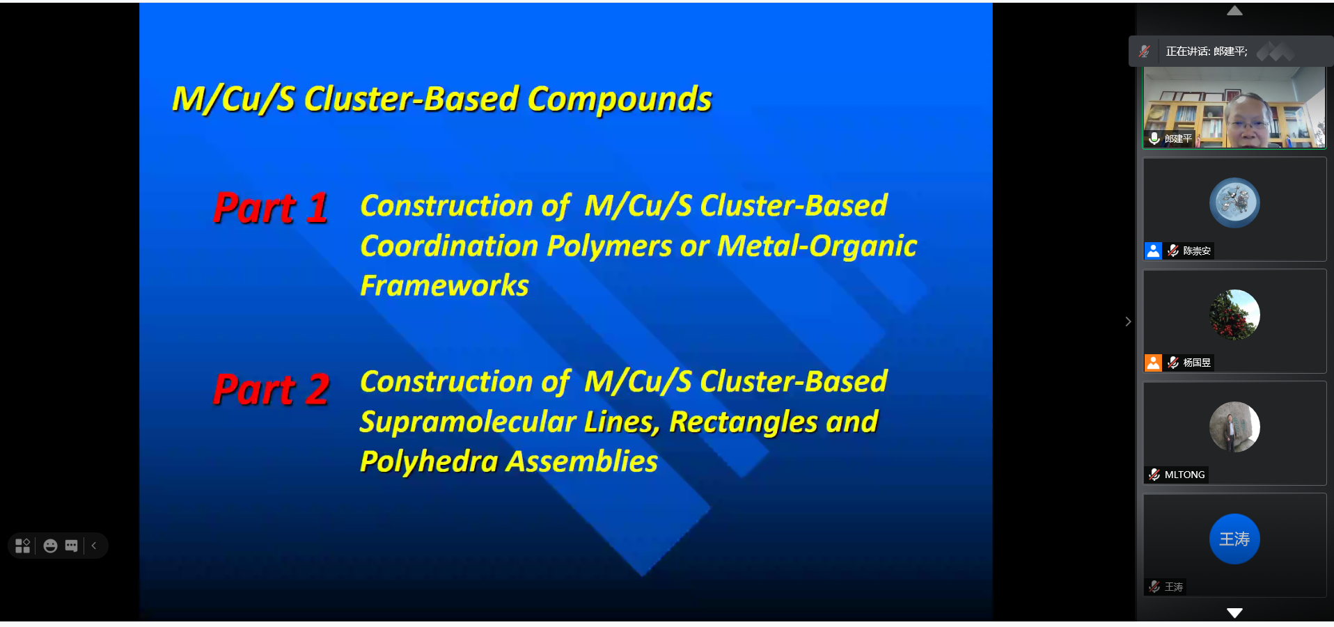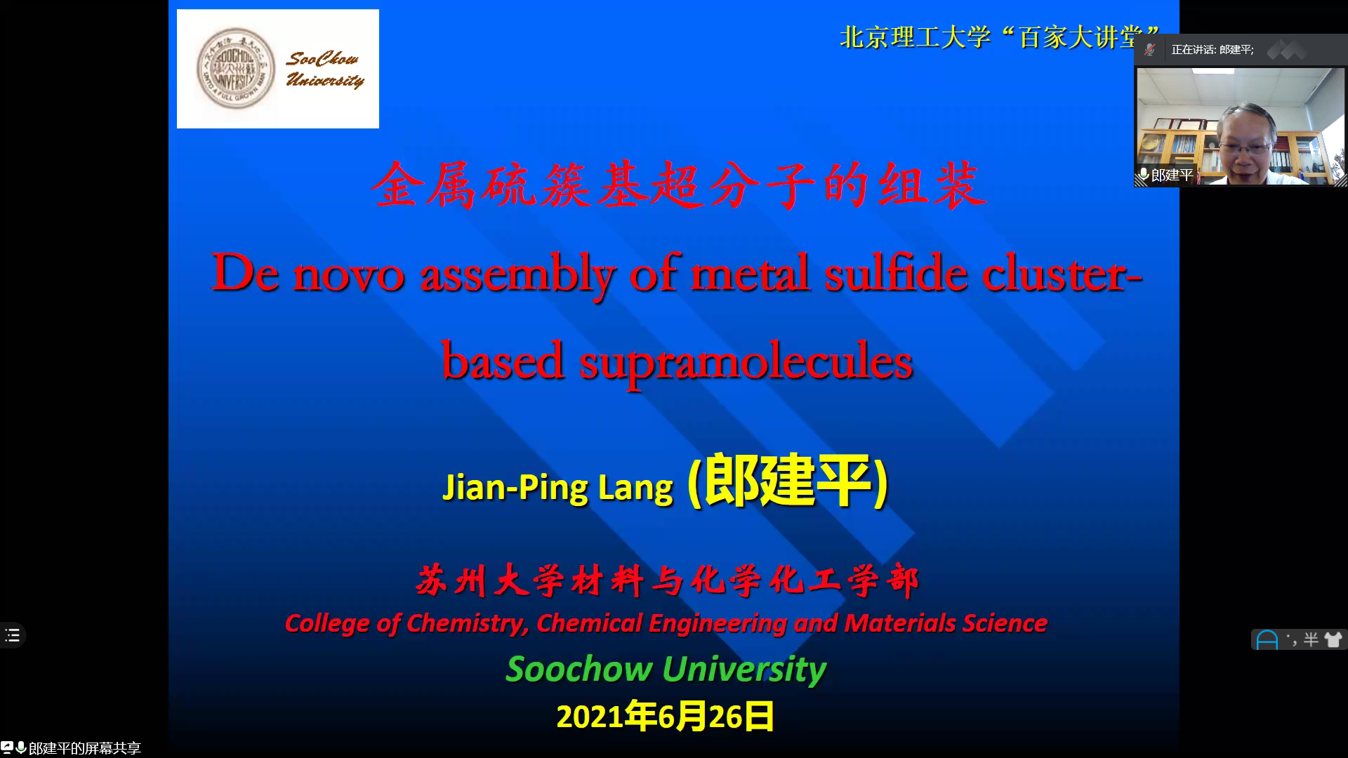 应taptap点点体育邀请,苏州大学郎建平教授于2021年6月23日14:20做客北理工“百家大讲堂”,为我院广大师生带来题为“金属硫簇基超分子的组装”的精彩学术报告。本次报告在腾讯会议平台线上进行,由杨国昱老师主持,近百名化院师生参加了报告。