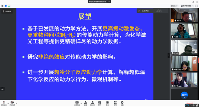 接着谢代前教授介绍了最近发展的包含近邻耦合的非含时传能动力学新方法,以及该方法在氟化氢化学激光器中重要的H-HF和HF-HF传能体系与超冷分子反应KRb+KRb中的应用及进展。报告结束后,与参会师生积极互动,对师生们提出的问题的进行了耐心且细致的解答,与会师生收获颇丰。